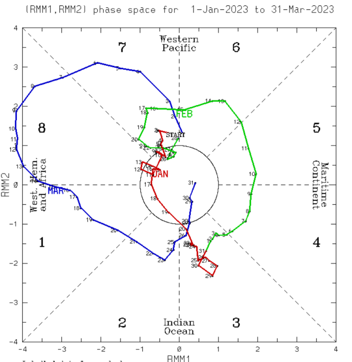 Leta 2023 je bil MJO aktiven med februarjem in marcem(pred začetkom močnega El Nina), kar je vplivalo na močne deževje v Avstraliji. V letu 2024 so opazili močan val, ki je prispeval k ekstremnim poplavam v jugovzhodni Aziji in celo vplival na orkane v Pacifiku. Trenutno, modeli kažejo, da MJO stagnira v fazi 8, kar bo prineslo hladnejše razmere v severni hemisferi, vključno z več snega v Evropi. Te dogodke spremljamo prek indeksov, kot je Real-time Multivariate MJO Index, ki pomaga napovedovati vplive tedne vnaprej.