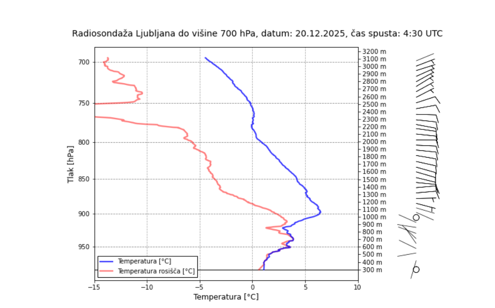 Imeli smo v notranjosti celo dva dni bolj sončnega in toplejšega vremena. Glavni razlog je zahodni veter malo višje, ki je premešal ozračje. Ko je zvečer veter popustil se je iz Panonske nižine pojavila megla oz. nizka oblačnost, ki sega tja do osrednje Slovenije in še malo naprej. Danes je ta plast nad Ljubljano trenutno debela okoli 350m, zjutraj pa je bila okoli 500m, torej malo verjetnosti da bi danes videli sonce.