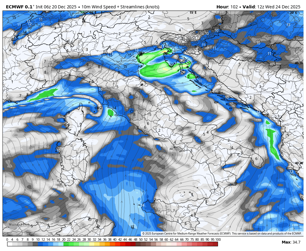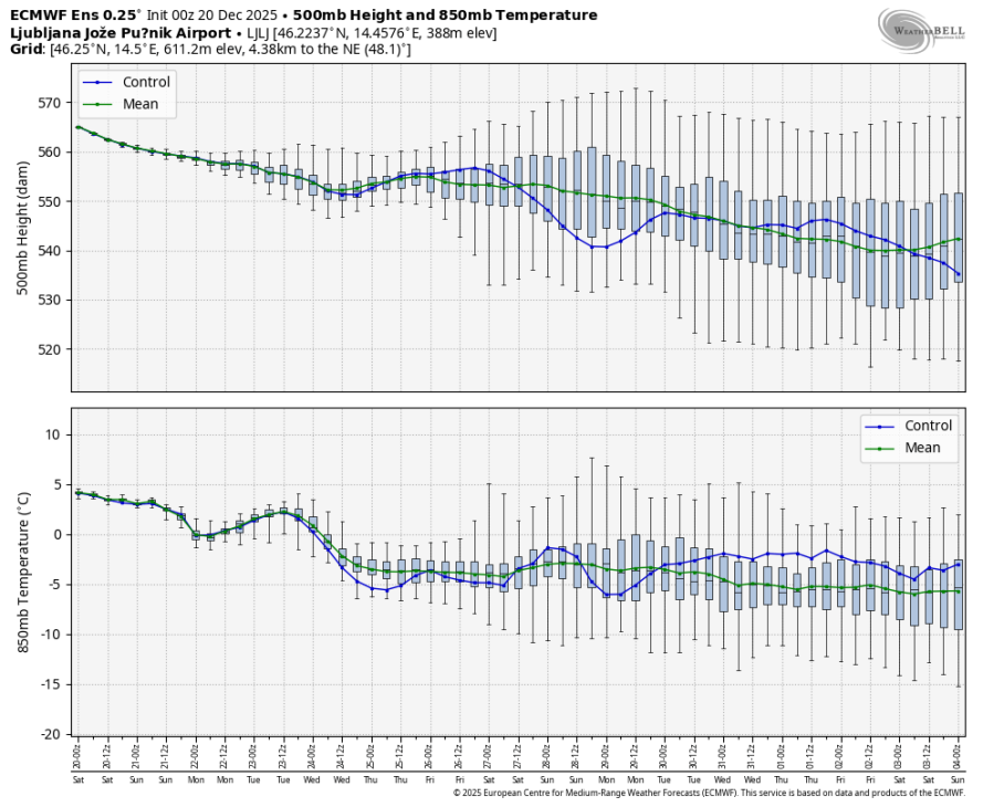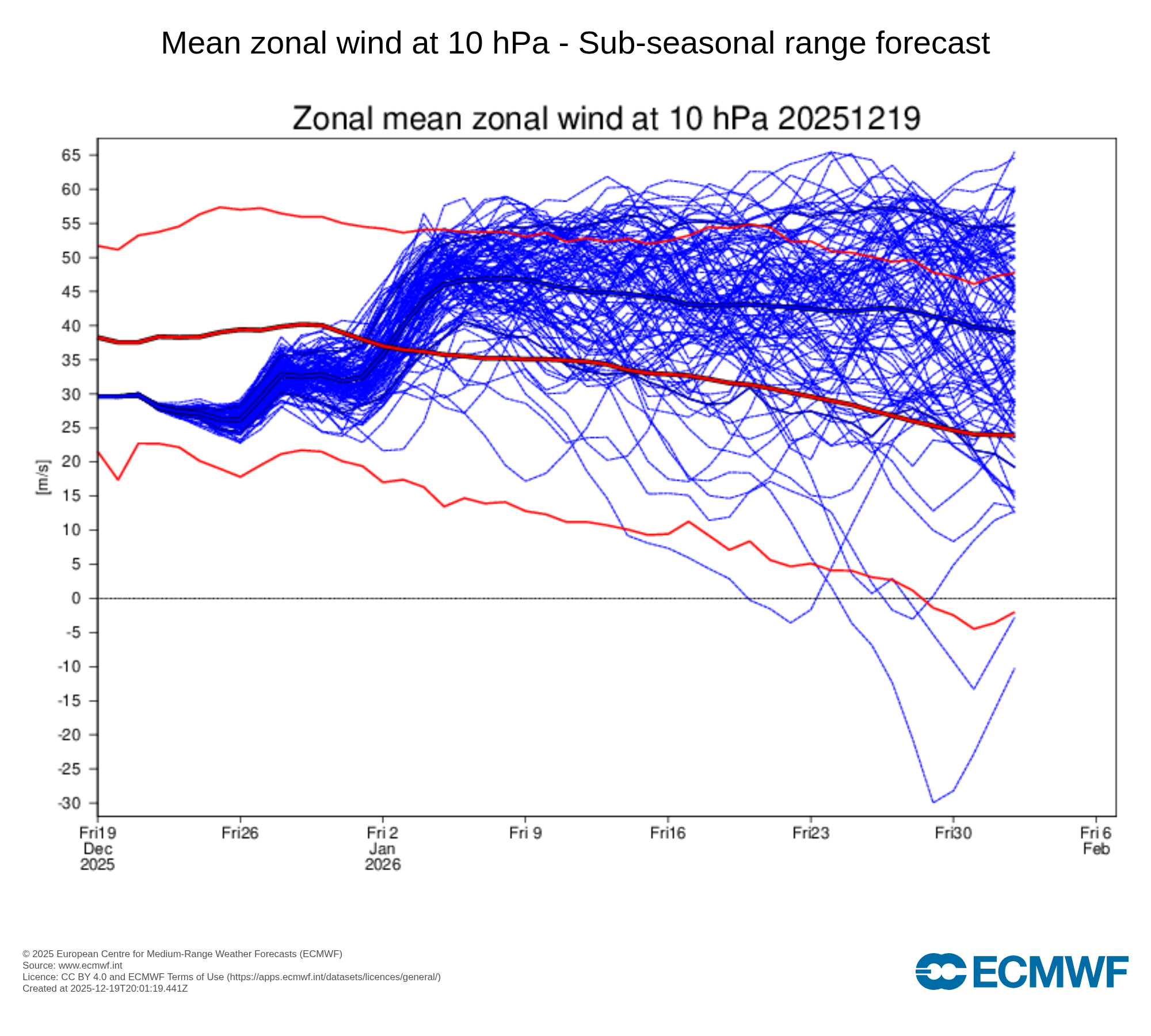 Trenutno je veter šibek okoli 25–30 m/s, kar kaže na še oslabljen vrtinec v zgornji stratosferi. Do začetka januarja ostane podobno, nato hitro naraste na okoli 45 m/s do 9. januarja, kar pomeni močan rebound v zgornjem delu. Do februarja rahlo popusti na 40 m/s, a ostane robusten. Erozija v spodnjem delu stratosfere lahko še nekaj tednov vzdržuje blokadne situacije na površju, preden se vpliv močnega vrtinca popolnoma prenese navzdol v bolj zonalen tok.
