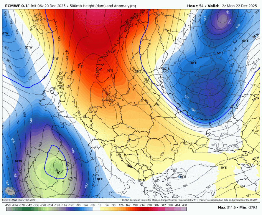 V drugi polovici tedna bo ciklon nad Sredozemljem oslabel, anticiklon pa se bo pomaknil iz Skandinavije nekoliko zahodneje proti Britanskemu otočju.