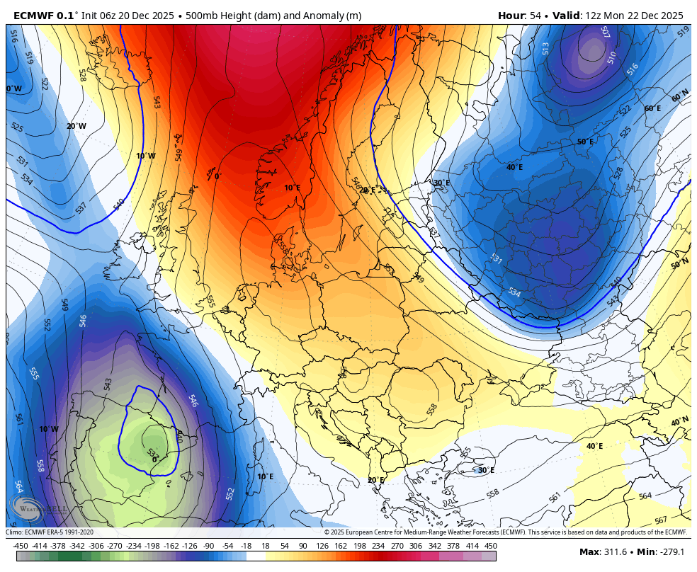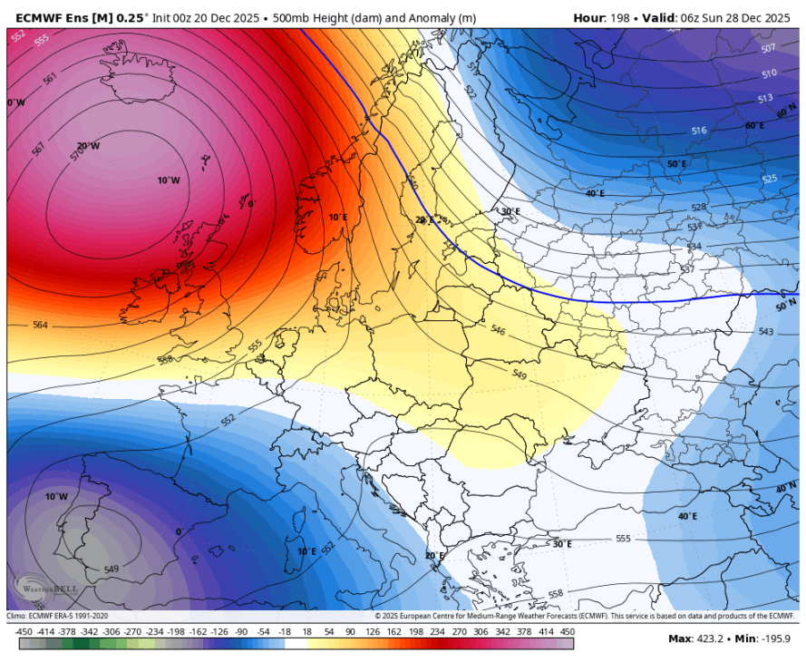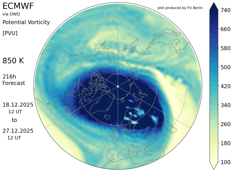 En hiter pregled stanja v atmosferi. Tole spodaj v temno modri barvi je jedro polarnega vrtinca v spodnjem delu stratosfere(850k okoli 50mb) za soboto 27.decembra. Jedro polarnega vrtinca je še vedno močno nad polom, vendar rahlo raztegnjen in s svetlejšimi območji na robovih, predvsem nad Skandinavijo. Te bele lise so znak erozije v spodnjem delu stratosfere, kjer valovi iz nižjih plasti postopoma odnašajo moč vrtinca, z enostavnimi besedami odžira ga iz spodnje strani. Erozija vzdržuje ranljivost vrtinca v plasteh, ki najbolj vplivajo na površinsko vreme, kar omogoča nadaljevanje blokad in hladnih razmer pri nas tudi po božiču.