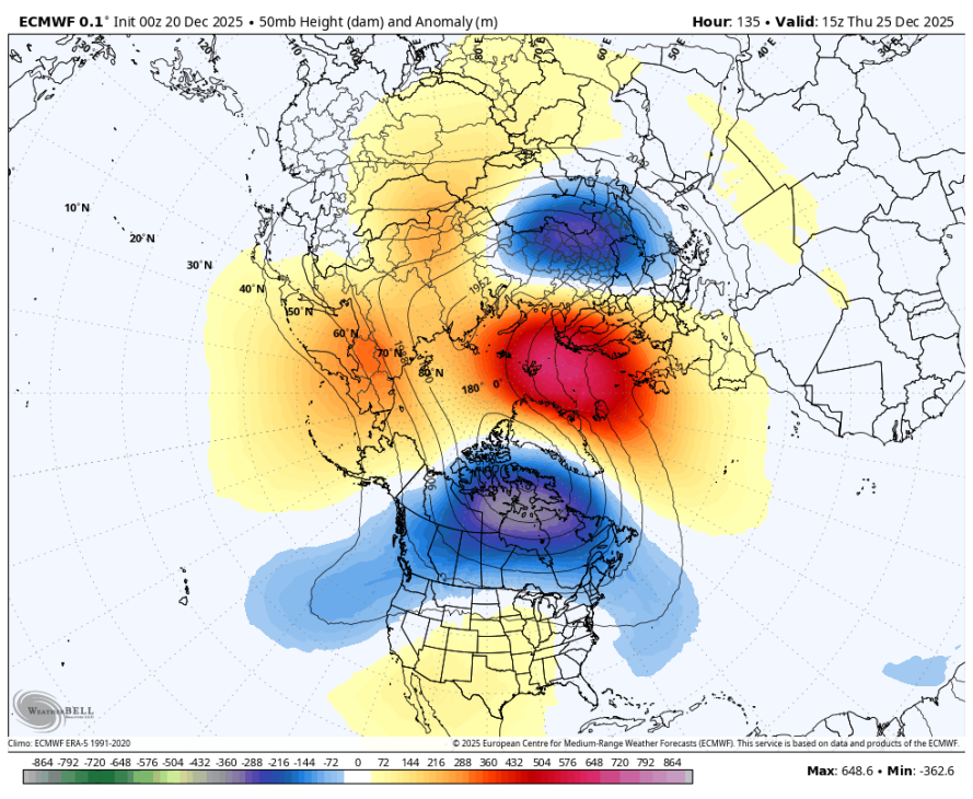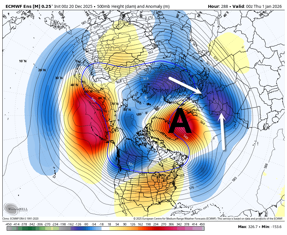 Močan greben nad Skandinavijo ustvarja idealne pogoje za navpično propagacijo planetarnih valov navzgor v stratosfero. Val 1 je na božični dan zelo izrazit v spodnjem delu stratosfere, kjer valovi dobijo dodatno energijo in se lomijo, kar vzdržuje oslabitev vrtinca na teh nivojih. Kasneje, proti koncu decembra ali začetku januarja, se lahko pojavi val 2 (dva “grebena”), vendar se ta val težje širi višje v zgornjo stratosfero (nad 10 hPa), kjer že poteka krepitev zahodnih vetrov.