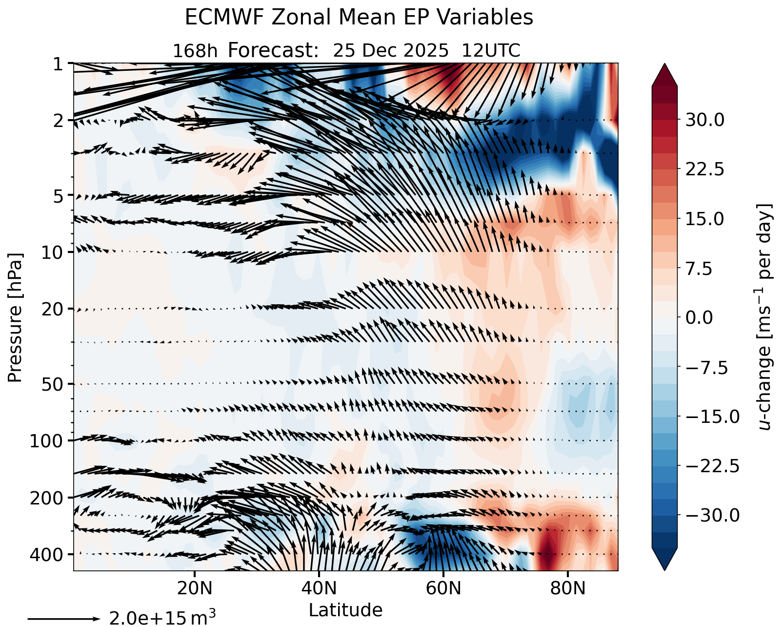 To valovanje navzgor iz naše troposfere vidimo odlično na EP fluxu. Močna valovna aktivnost iz troposfere navzgor nad 60°N z modrim območjem konvergence se višje obrača v severozahodno smer, na vrhu stratosfere pa preide v rdeče z divergenco proti jugozahodu. Nad polom ni puščic, kar pomeni, da valovi ne dosegajo jedra vrtinca. To kaže na postopno krepitev v zgornji stratosferi, medtem ko valovi še vzdržujejo oslabitev v srednjem in spodnjem delu, kar podpira blokadni vzorec na površju.