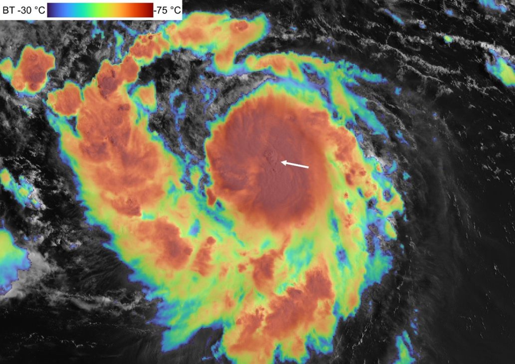 Tropska nevihta Erin, ki jo je zajel geostacionarni satelit GOES-19 15. avgusta ob 13:00 UTC. Bela puščica prikazuje lokacijo vročega stolpa.