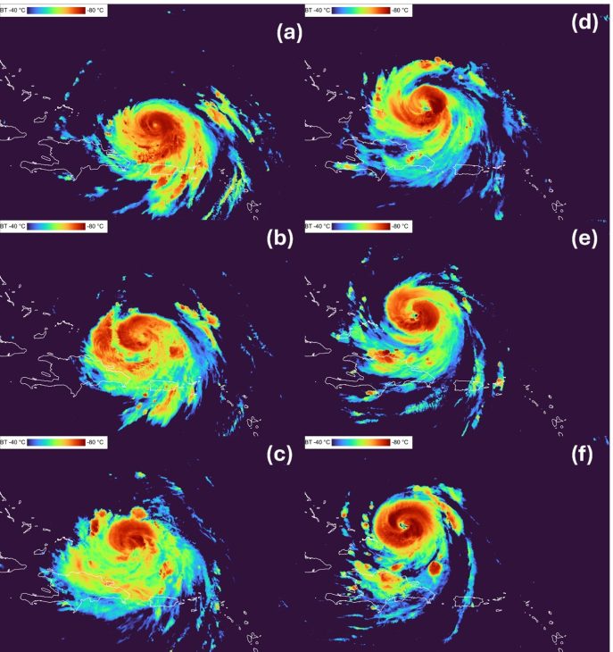 Cikel zamenjave očesne stene (ERC) v primeru orkana Erin v 4-urnem zaporedju med 11:00 UTC 17. avgusta in 07:00 UTC 18. avgusta. Posnetki prikazujejo satelitske posnetke iz GOES-19 v toplotnem pasu atmosferskega okna (kanal IR 10.3).