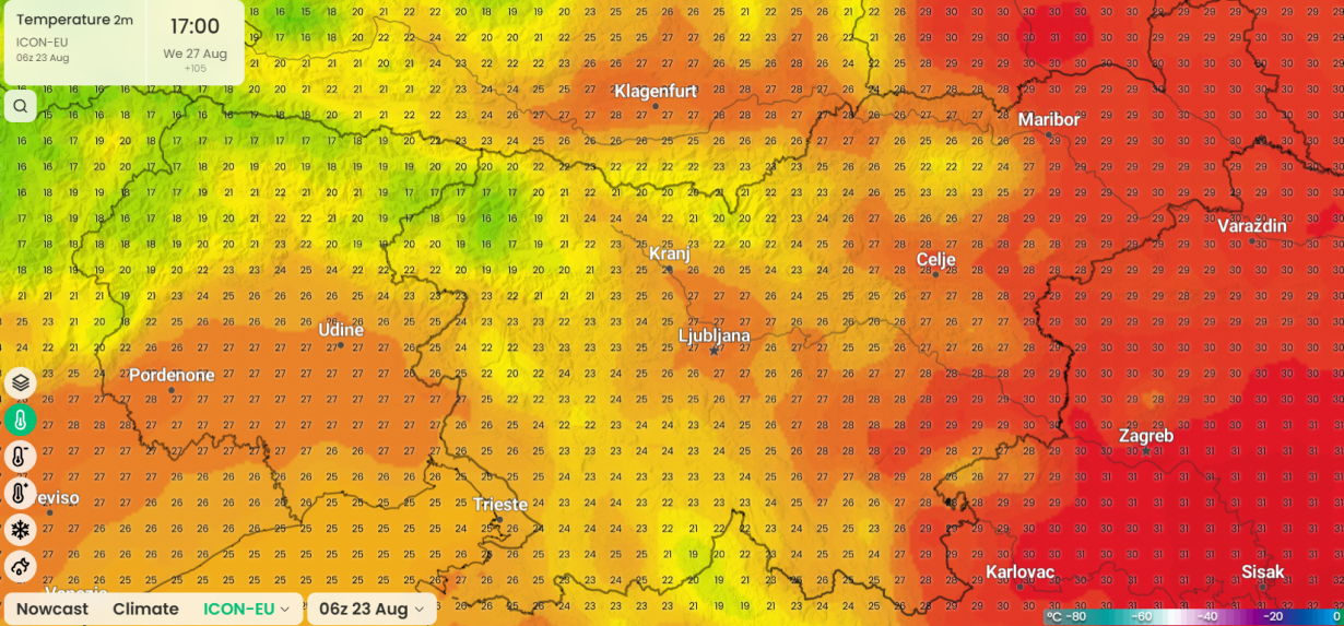 V sredo bodo temperature spet dosegle bolj poletne vrednosti, na vzhodu ob jugozahodniku malo čez 30 °C(imweather)