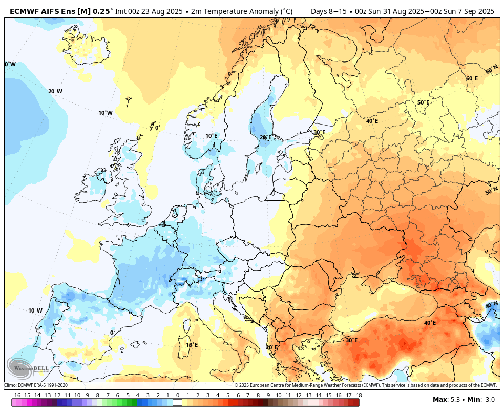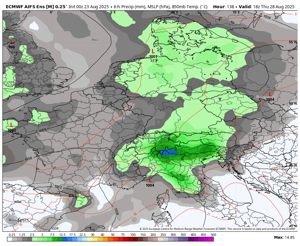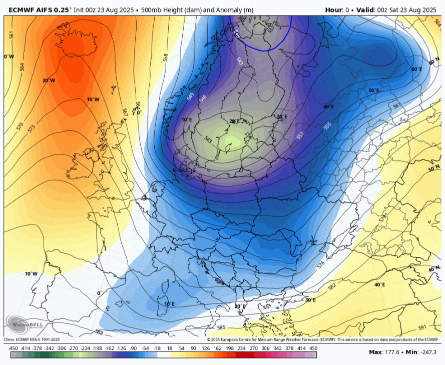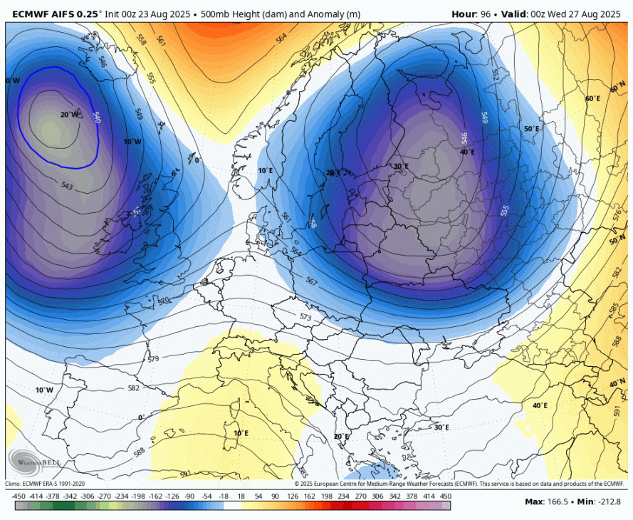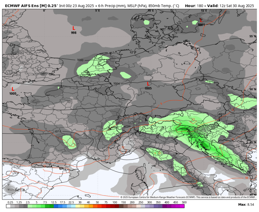 Sedaj je Erin postal ekstratropski ciklon, se je pa zgodilo tisto kar sem pričakoval, prehod višinske motnje čez Srednjo Evropo v torek je bil s strani evropskega modela izbrisan. AI je imel precej severnejšo pot Erina čez severni del Atlantika, zato AI z novo različico postaja precej uporaben model za obdobje med 5-10 dni.