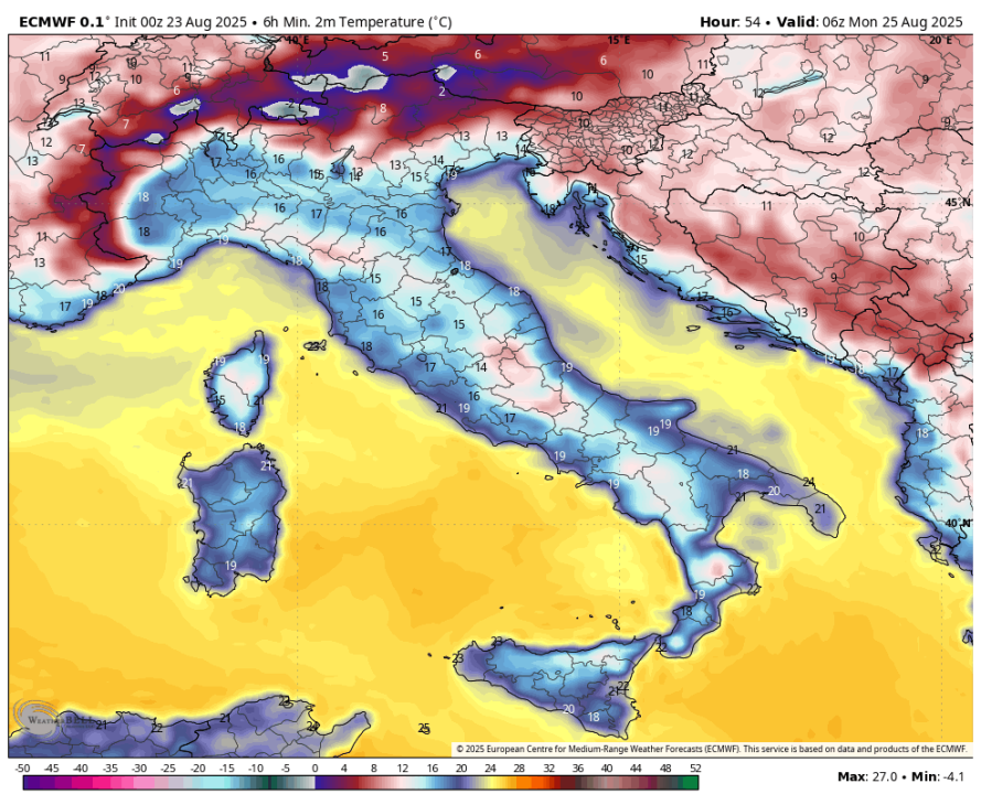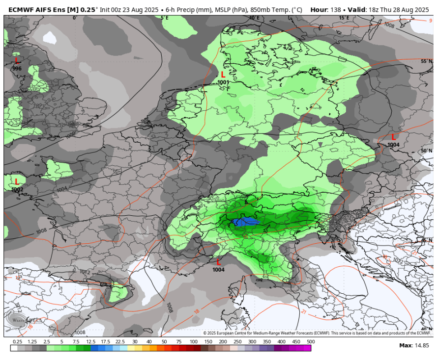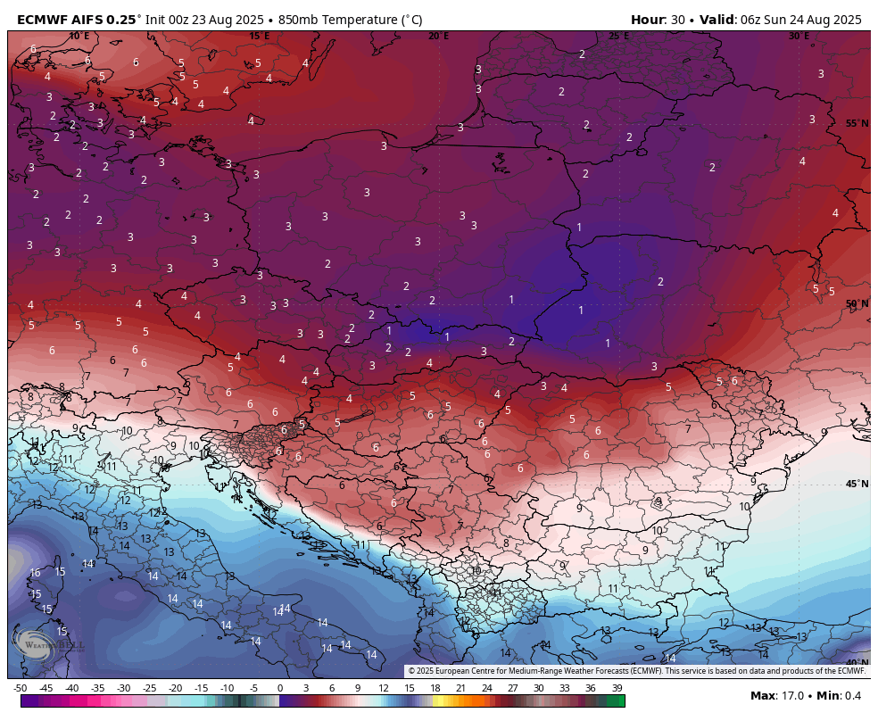 Jutri se bo spustil proti Srednji Evropi precej mrzel zrak za konec avgusta, podoben tistemu iz leta 1995, ko smo videli sneženje tja do 1300m. Na severovzhodu se bo temperatura spustila tja do +5 °C na 850mb(n.v. približno 1500m). Torej če imamo danes na Rogli okoli 10 °C, se bo jutri zjutraj temperatura okoli +4 °C.