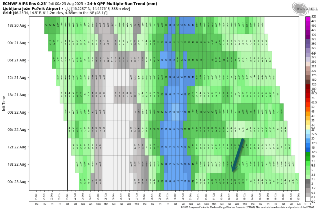 Če pogledamo padavinski meteogram se strinja s tem razvojem, ki sem ga napisal po prehodnem suhem obdobju pa se obeta očitno novo poslabšanje v prvih dneh septembra, kar bi pomenilo čisti prehod v jesenske dni in slovo od poletja.