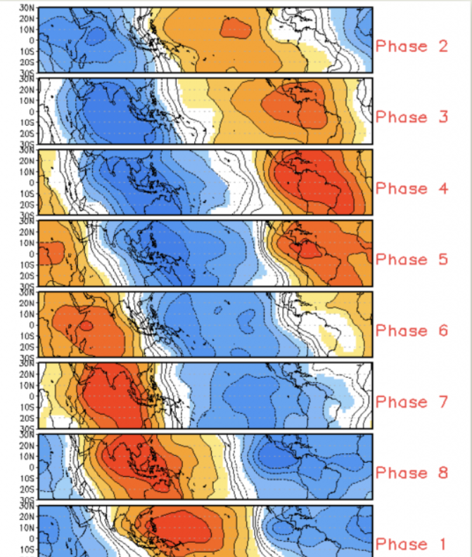 V poletnem času sem se redko poslužil MJO (Madden-Julian oscilacije) za vremenske napovedi, saj je bil njen vpliv šibkejši, predvsem pa je bila v večjem delu poletja znotraj nevtralnega območja, kar pomeni, da ni imela zadostne moči za pomembne vremenske spremembe. MJO se od ENSO (El Niño Southern Oscillation) razlikuje po svoji dinamični naravi; medtem ko je ENSO bolj statičen pojav, se MJO premika proti vzhodu. Ta premikajoč pas oblakov prinaša padavine in ga najdemo v tropskih predelih Indijskega in Tihega oceana.