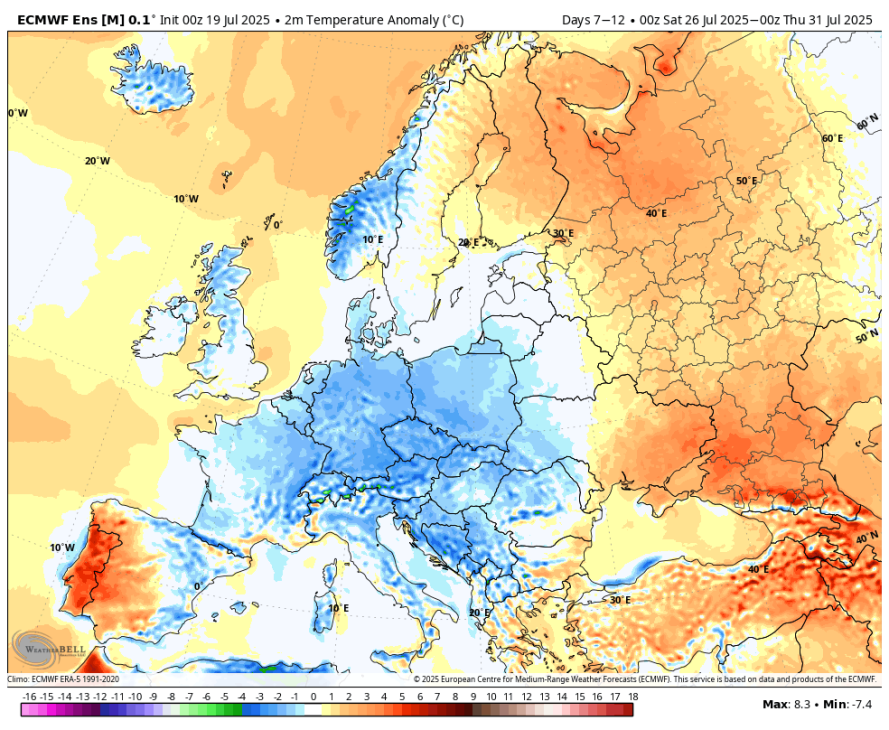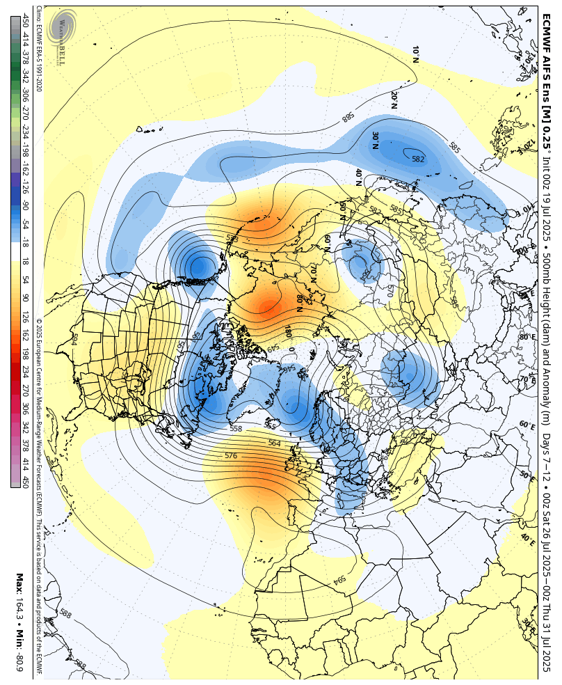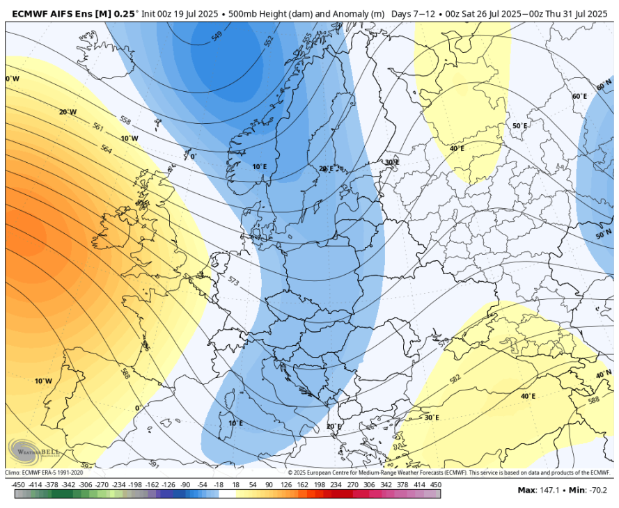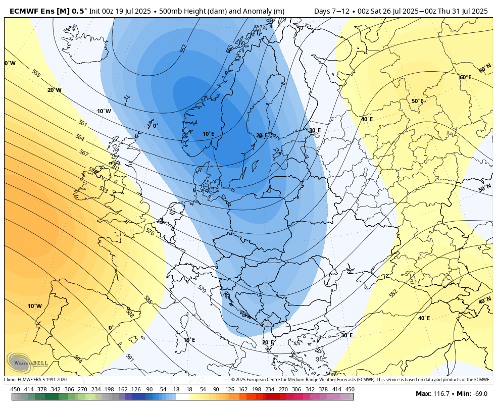 Ob koncu naslednjega tedna in v zadnjih dneh julija se bo ciklonsko območje poglobilo nad Skandinavijo, nad severnim delom Atlantika pa se bo krepil anticiklon. Kot zaenkrat kaže, bomo mi v polju enakomernega zračnega pritiska, občasno negativnega, v višinah bo pihal severozahodni veter, v nižjih plasteh pa bodo prevladovali severni vetrovi z burjo na Primorskem. Občasno pa bodo območje Alp dosegale vremenske motnje. Ob taki vremenski sliki si lahko obetamo sončno vreme z občasno spremenljivostjo, vendar brez vročine, temperature bodo primerne letnemu času oz. nekoliko pod povprečjem. Bolj vroče bo nad jugovzhodno Evropo.