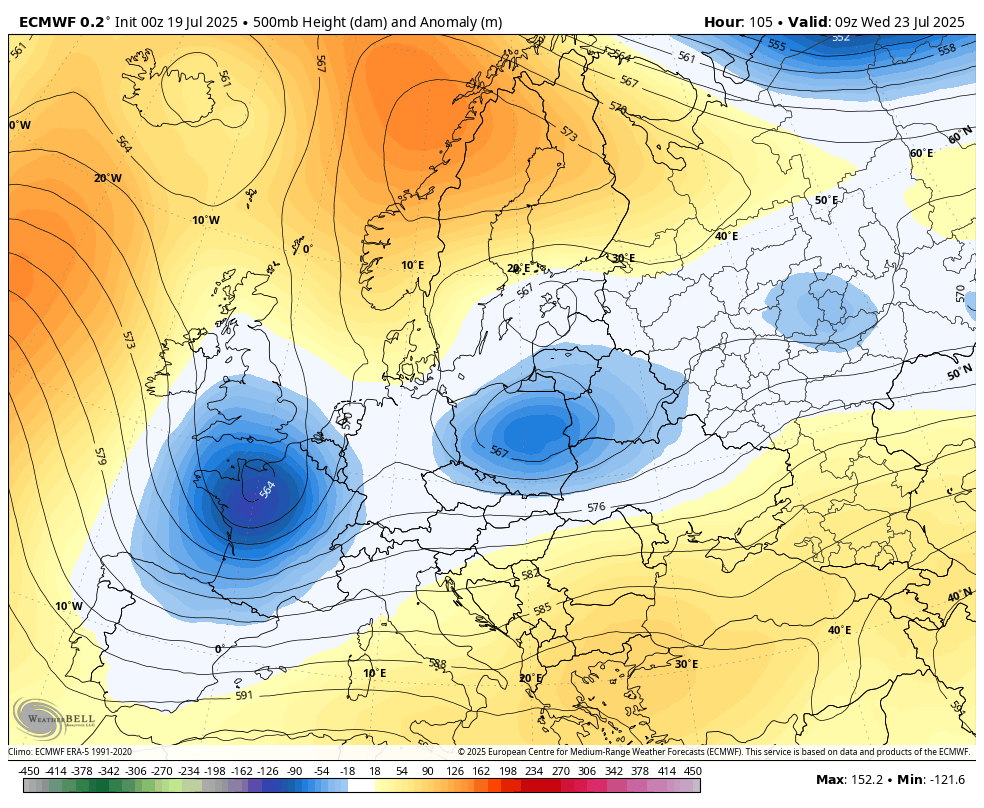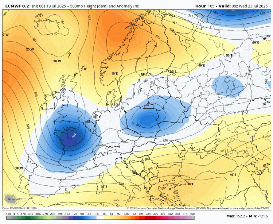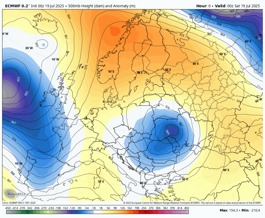 Moje napovedi iz prejšnjih zapisov gredo kar po planu, Britansko otočje je zajelo deževje, saj se obsežno območje nizkega zračnega pritiska bliža Biskajskemu zalivu in se bo v naslednjih dneh še nekoliko poglobilo. Skandinavija pa ima trenutno vročinski val. Ciklon z vremensko fronto se bo začel bližati Alpam.