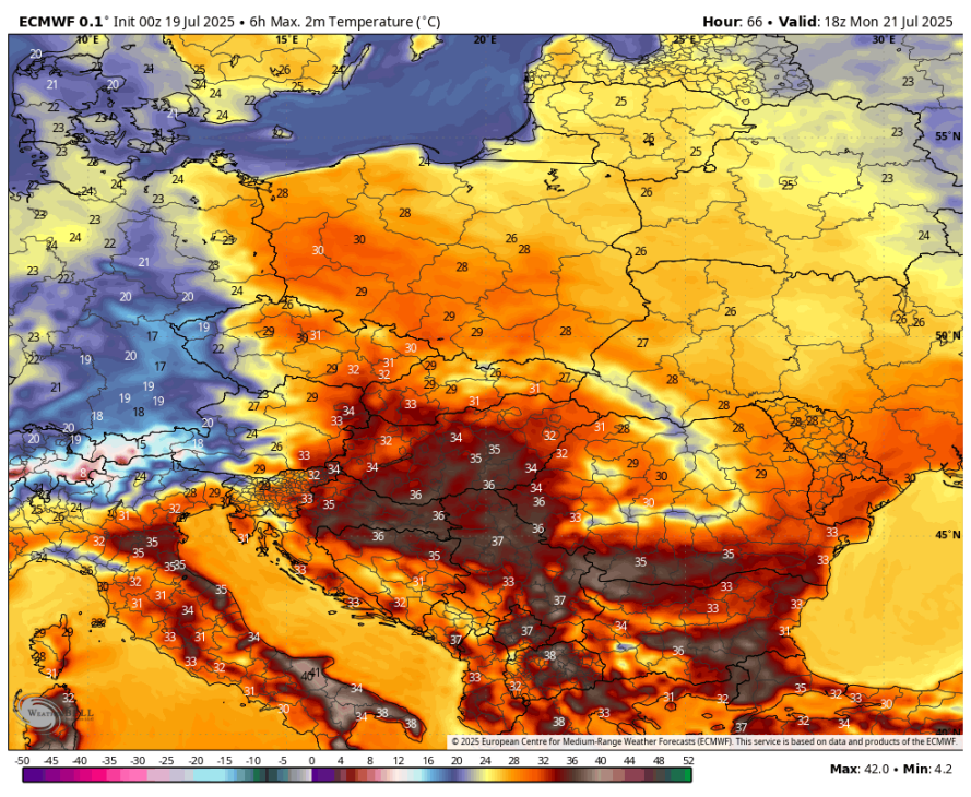 Temperature bodo iz dneva v dan nekoliko višje, ampak kakšnega vročinskega vala v celinskem podnebju ne bo. Višek tega toplotnega vala bo v ponedeljek, ko se bo ponekod na vzhodu ob okrepljenem jugozahodnem vetru segrelo do +35 °C.