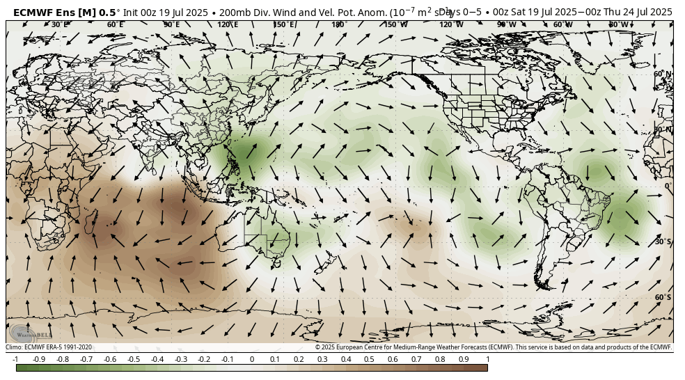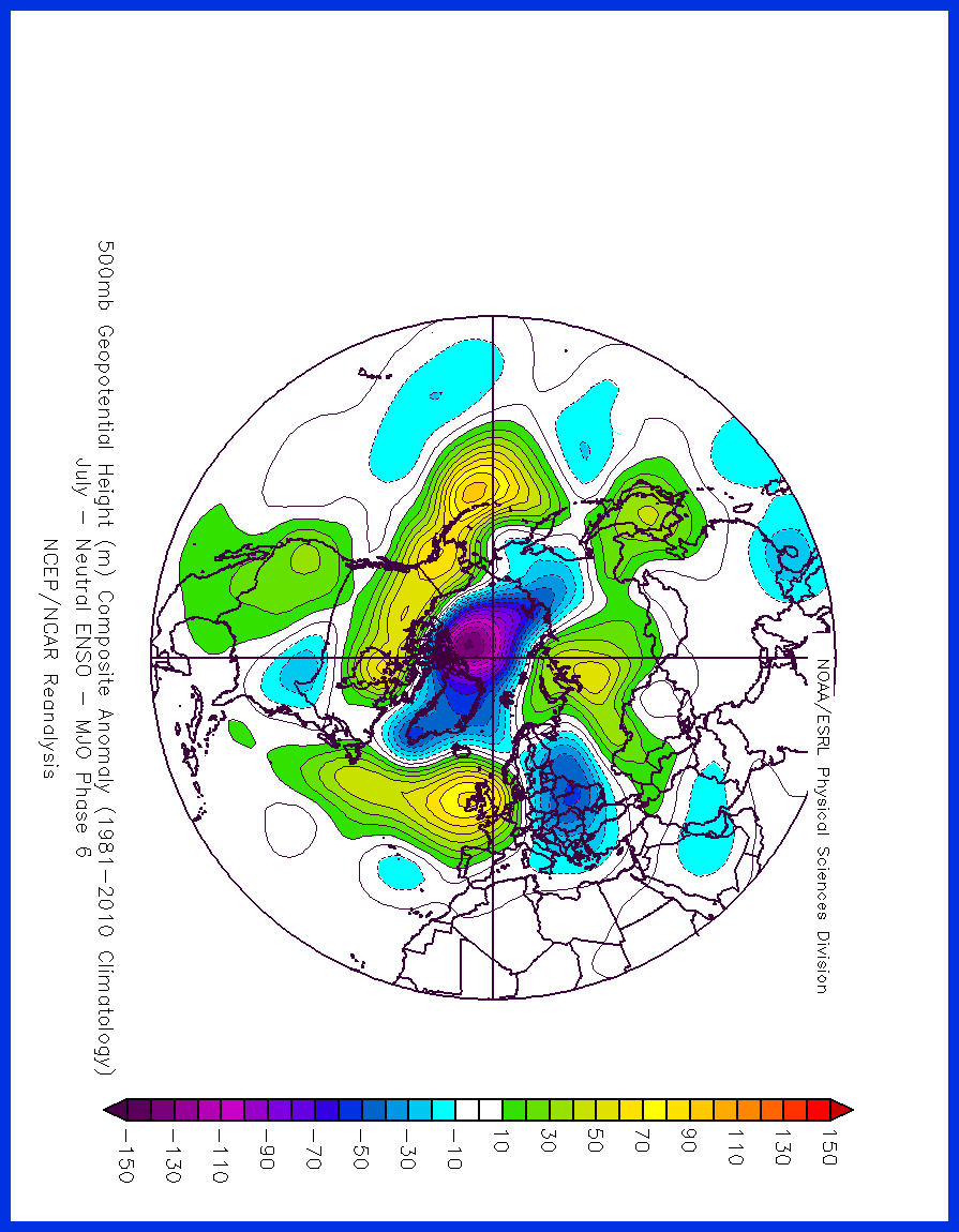 Kompozitna anomalija geopotencialne višine na višini 500 hPa za mesec julij, v pogojih nevtralne ENSO (torej brez El Niño ali La Niña vpliva) in v 6. fazi Madden-Julian Oscilacije (MJO).