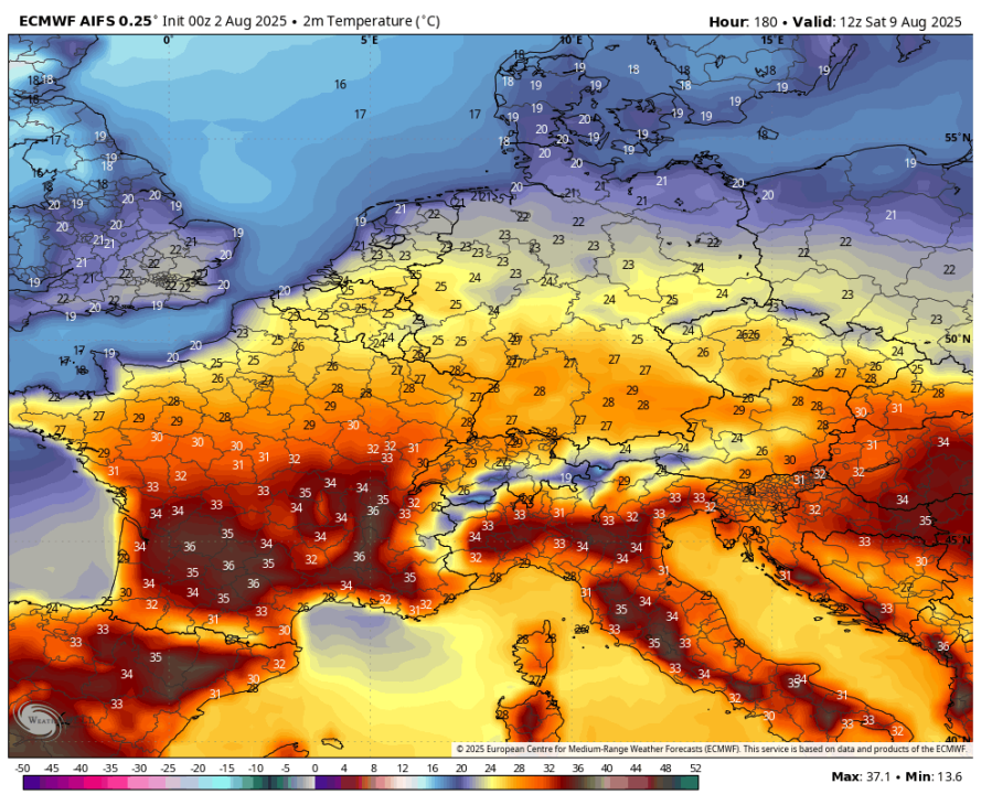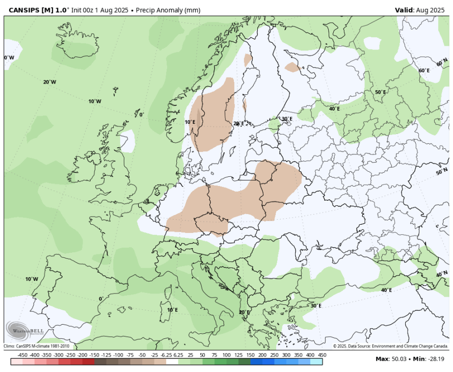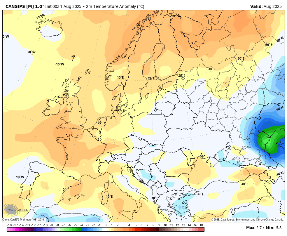 Letošnji avgust se je začel z bolj spremenljivim vremenom in občasnimi padavinami. Po podatkih kanadskega sezonskega napovednega modela, ki analizira globalne vzorce, se lahko v avgustu pričakuje temperaturno povsem normalen avgust. Model nakazuje, da bi nad območjem Alp ne bilo večjega odstopanja v primerjavi s periodo 1991–2020.