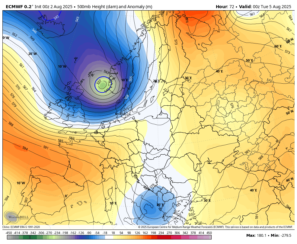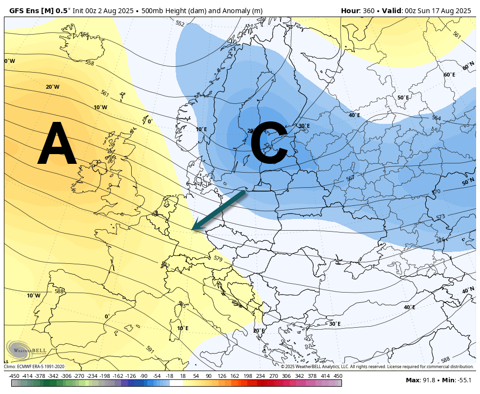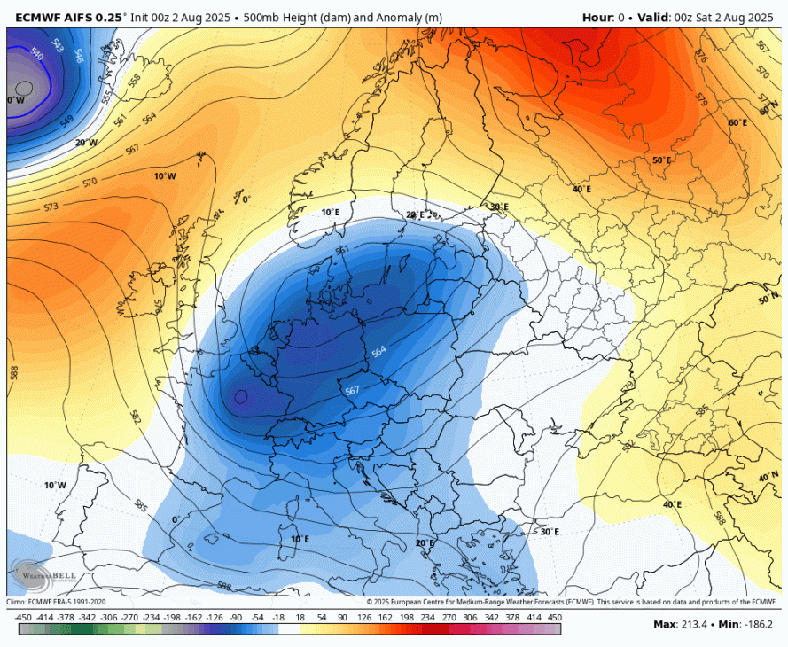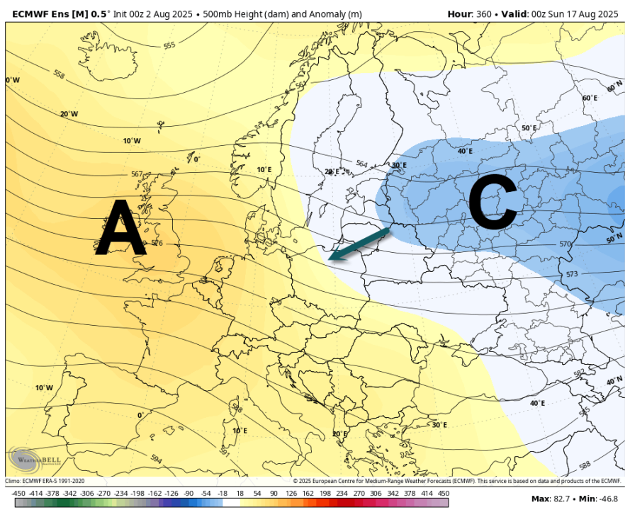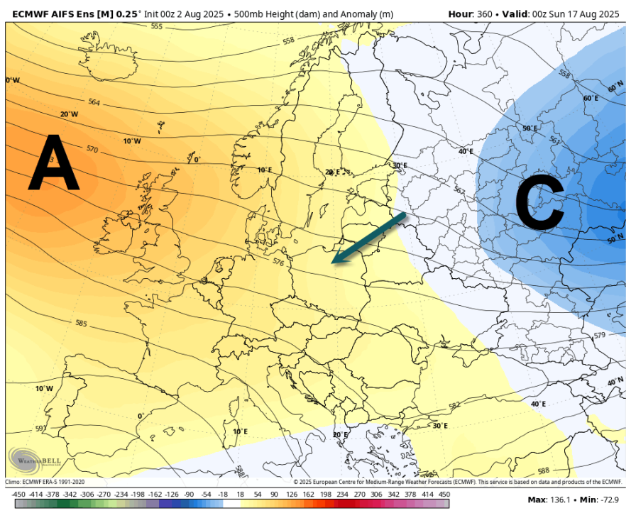 V zadnjih dneh meteoroloških izračunov opazujem vse pogostejše pojavljanje negativnih temperaturnih anomalij nad severno in vzhodno Evropo proti zadnji avgustovski dekadi, kar pomeni, da se temperature v teh predelih dosledno odklanjajo od dolgoletnega povprečja za to obdobje. Te anomalije nakazujejo, da se v zračne tokove vse bolj vpleteni vplivi hladnejših zračnih mas, ki prihajajo iz severnejših ali vzhodnejših regij, kar bi lahko prineslo zmerno nižje temperature. Hkrati pa skupinski izračuni vodnih svetovnih modelov – vključno z ameriškim modelom GFS, evropskim modelom ECMWF in naprednimi napovedmi, ki uporabljajo umetno inteligenco – kažejo na postopno premikanje območja visokega zračnega tlaka proti severnejšim delom Atlantskega oceana.