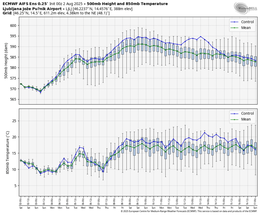 Izračun AI je precej vroč, kontrolni izračun kaže na možnost toplotne kupole nad našim območjem z vrednostmi čez 590 dekametrov za daljše obdobje