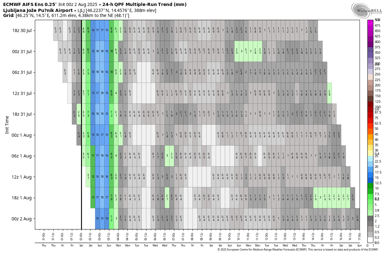Proti zadnji dekadi je videti po skupinskem izračunu AIFS vpliv nekoliko hladnejših zračnih mas z vzhoda Evrope