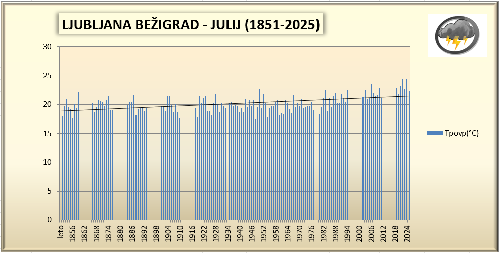 Če pogledamo gibanje povprečne julijske temperature od leta 1851 ugotovimo, da letošnji julij temperaturno ni bil nič posebnega, celo julij 1859 je bil samo za dve desetinki hladnejši in to brez pomoči urbanizacije. Taka temperatura če so seveda podatki pravilni je bila za tiste čase nekaj precej ekstremnega. Sicer pa bo letošnji julij v Ljubljani okoli dvajsetega mesta od začetka meritev.