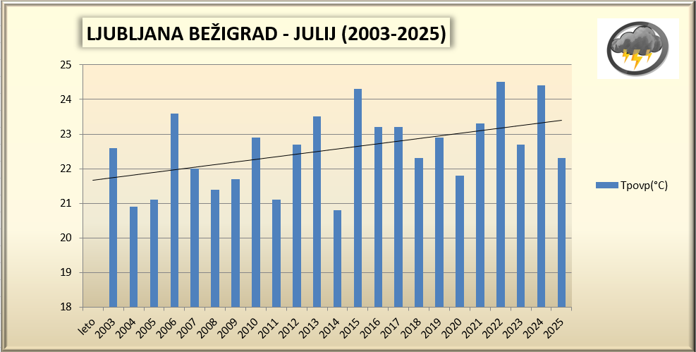Povprečna temperatura je bila v Ljubljani 22,3 °C, kar je 0,4 °C več od dolgoletnega povprečja 1991-2020 in dve stopinji manj kot smo jih imeli junija. Enako odstopanje je bilo na letališču Portorož, nekoliko manjše na Kredarici(+0,3 °C) in v Celju +0,1 °C.
