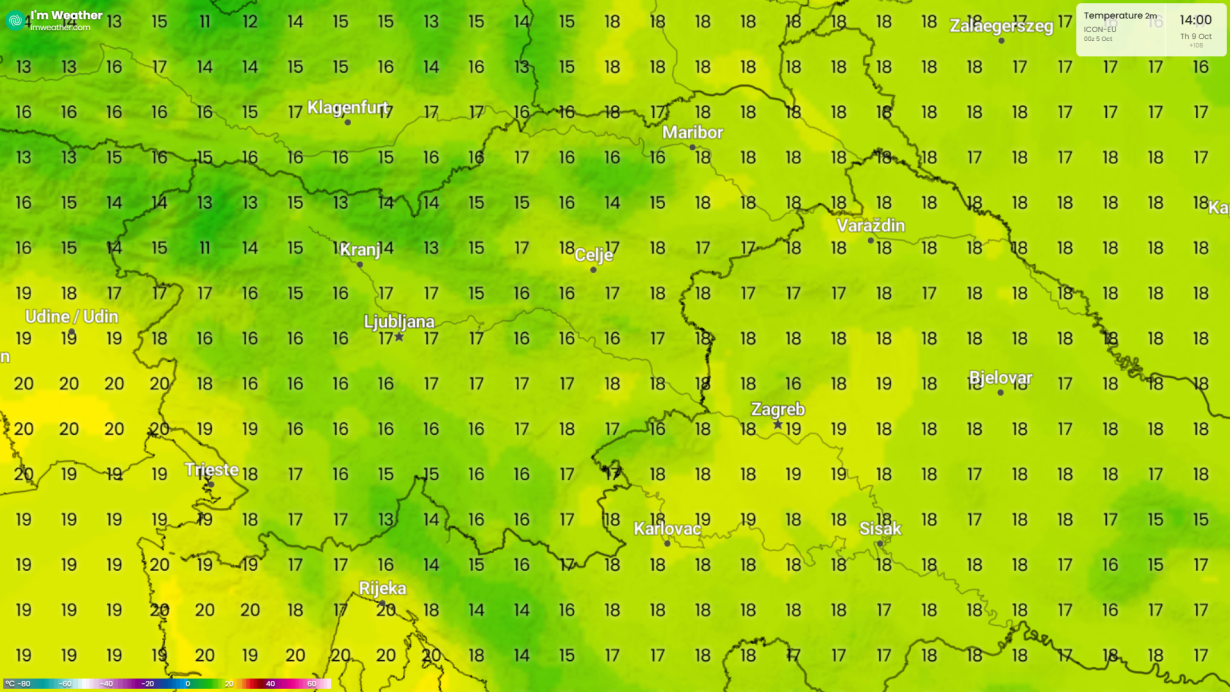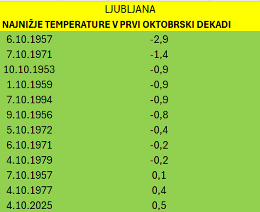 Včerajšnje jutro je bilo najhladnejše v tem tisočletju v prvi oktobrski dekadi(po letu 2001). V Ljubljani je bila minimalna temperatura +0,5 °C. Nazadnje je bilo tako hladno 4.oktobra leta 1977, torej po 48 letih. Ključno je poudariti razliko med uradnimi meritvami in razmerami v širši aglomeraciji. Merilna postaja Bežigrad se nahaja v urbanem jedru, kjer je pojav urbane toplotne otoke (Urban Heat Island – UHI) izrazito izražen. Ta fenomen, pri kateri urbana površina zaradi asfalta, betona in človeške dejavnosti zadržuje več toplote kot podeželska okolica, znatno zviša nočne temperature. Hkratne meritve na obrobju mesta (npr. v Ljubljanski Barju, na Golovcu ali v okoliških vaseh) so resnično potrdile temperaturo večinoma pod lediščem. To nakazuje, da je bil v naravnem, neurbanem okolju dejanski zračni minimum verjetno za 3 do 4 °C nižji od uradnega. Primerljiv z 6.oktobrom leta 1957, takrat velja po podatkih po letu 1948 za najnižji minimum v prvi oktobrski dekadi.