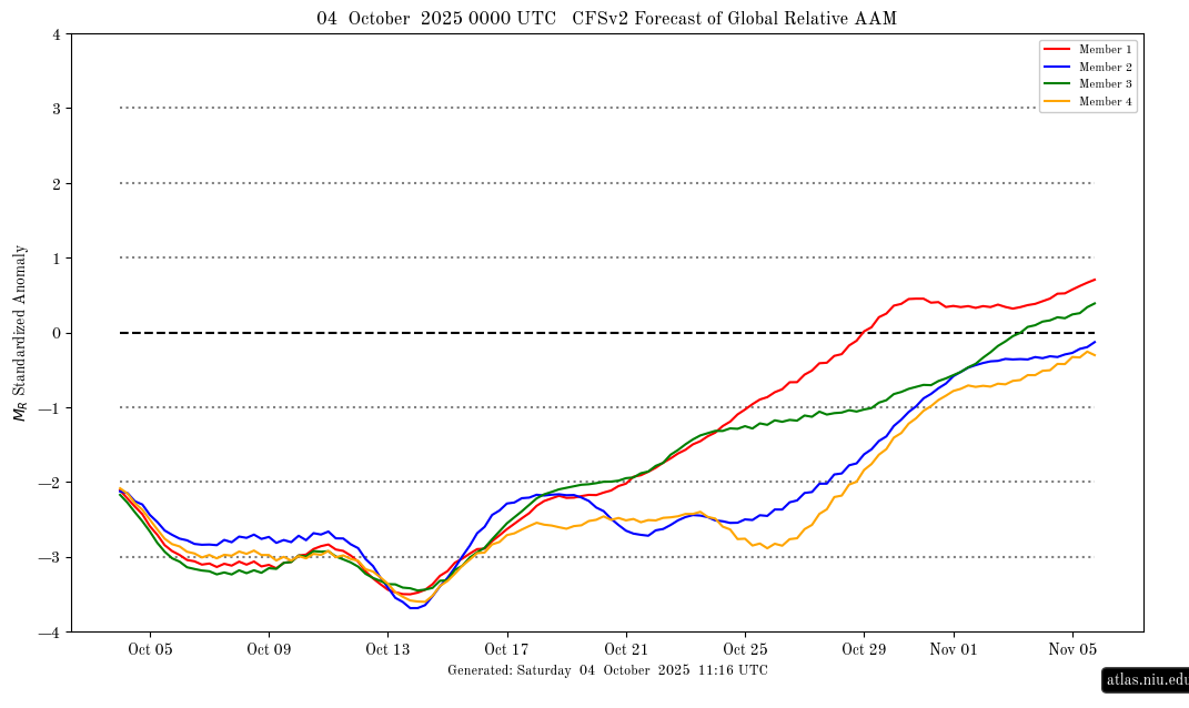 Atmosferska angularna momenta (AAM) in Madden-Julianova oscilacija (MJO) sta že v zadnji septembrski dekadi nakazala prehod k atmosferskim razmeram, karakteriziranim z izrazitim meridionalnim tokom in posledično znižanimi temperaturami, kar se je kasneje tudi uresničilo v podnebnih razmerah. Negativna faza AAM, ki je bila takrat opažena, je bila povezana s šibkejšim zahodnim prenosom zračnih mas in okrepitvijo blokirnih sinoptičnih vzorcev, kar je spodbudilo prodiranje hladnejšega zraka iz severnejših širin. Ta trend se nadaljuje, pri čemer AAM še vedno ostaja v negativnem območju, vendar se pričakuje njen postopen prehod v pozitivno fazo v drugi polovici meseca. Ta prehod je pomemben, saj vpliv sprememb AAM na vremenske razmere ni takojšen, ampak se odraža s tipično zakasnitvijo 7–10 dni, kar pomeni, da bodo morebitne posledice povečane zonarnosti in toplejših razmer verjetno opazne šele ob koncu oktobra ali začetku novembra. Do takrat lahko še naprej pričakujemo vremenske vzorce, ki bodo podprti z meridionalnim tokom in hladnejšimi temperaturami, vse dokler se AAM ne ustali v pozitivnem območju in njegovi učinki postanejo opazni v spodnjih tropostih.