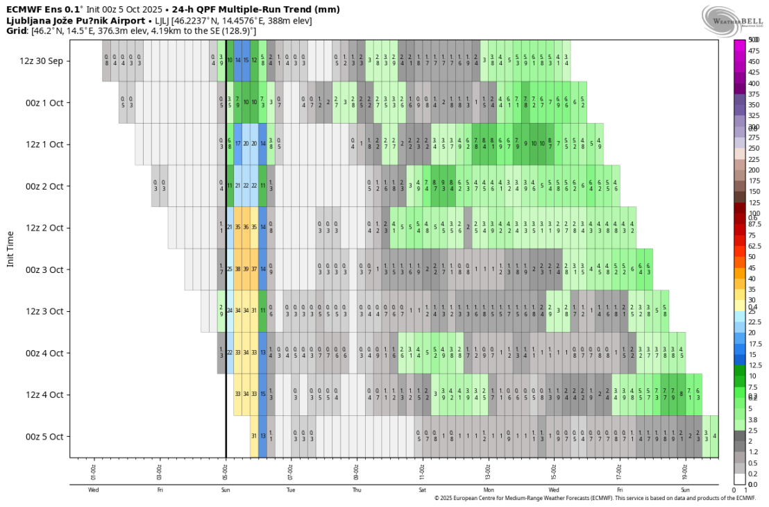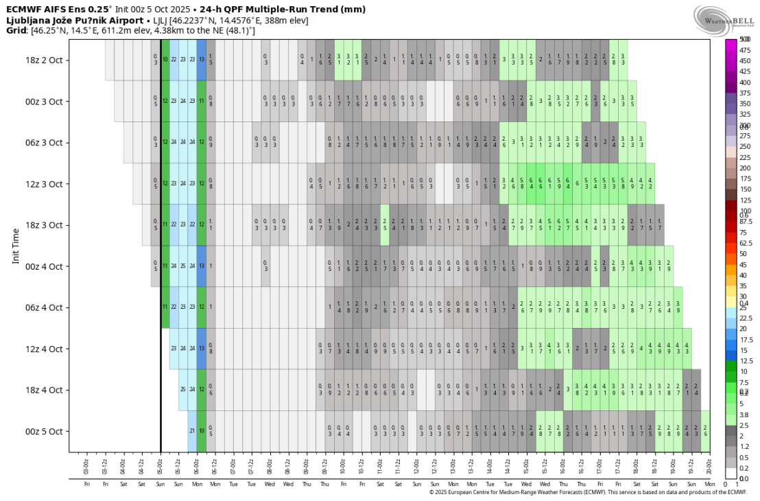 Padavine bodo popoldne oslabele in zvečer povsod večinoma ponehale, čaka nas daljše obdobje večinoma suhega vremena. Ciklonsko območje se bo pomaknilo nad jugovzhodno Evropo, nad severozahodno Evropo se bo prehodno okrepilo območje visokega zračnega pritiska zato bo pritekal nekoliko toplejši zrak. Vendar temperature bodo ostale v skladu z dolgoletnim povprečjem ali malo pod njim. Treba poudariti da bodo manjše padavine prisotne tudi jutri in v torek, tam kjer topografija ne povzroča Föhn efekta ali sušenja padavin. Največ možnost je seveda, kjer ni visokih hribov v severovzhodni Sloveniji.