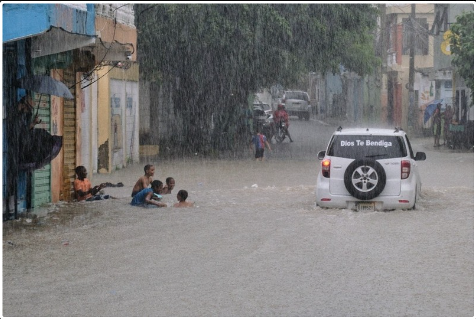 Otroci se igrajo na ulici, ki jo je poplavilo deževje, ki ga je povzročila tropska nevihta Melissa v Santo Domingu v Dominikanski republiki, petek, 24. oktober 2025.
