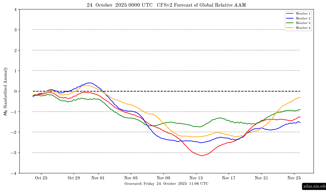 Glede na stanje AAM in efekt segrevanja v stratosferi in tropski sistem Melisso, ki se bo pomikala proti severovzhodu se lahko v drugi novembrski dekadi temperaturno lahko spet obeta prehod v bolj meridionalni vremenski režim. AAM je agregatni kazalnik porazdelitve vrtilnosti v atmosferi in reflektira, koliko “vrtilnega momenta” nosi atmosferski sistem. Hitri in močni premiki v tropski konvekciji lahko privedejo do znatnega prenosa vrtilnosti in posledično do padcev AAM. Ko AAM znatno pade, se zmanjša skupna podpora zonalnemu toku in se poveča verjetnost premika proti bolj meridionalnemu toku, z večjo pogostostjo blokad in globokih vdihov hladnega zraka. Časovni zamik med tropskim impulzom in odzivom AAM je pogosto večtedenski, zato je natančna usklajenost ključni dejavnik pri oceni, ali bodo ti signali delovali konstruktivno in povzročili izrazit prehod v drugačno cirkulacijsko stanje.