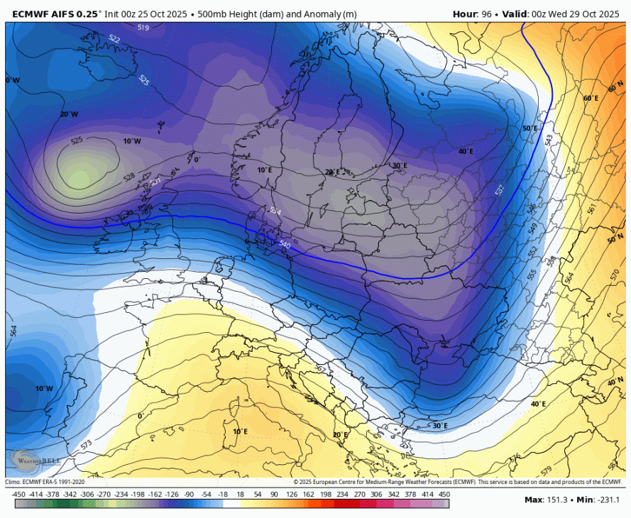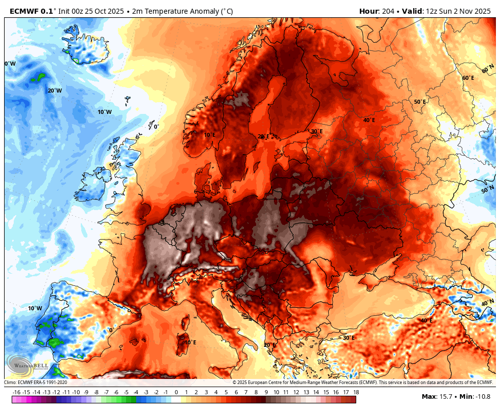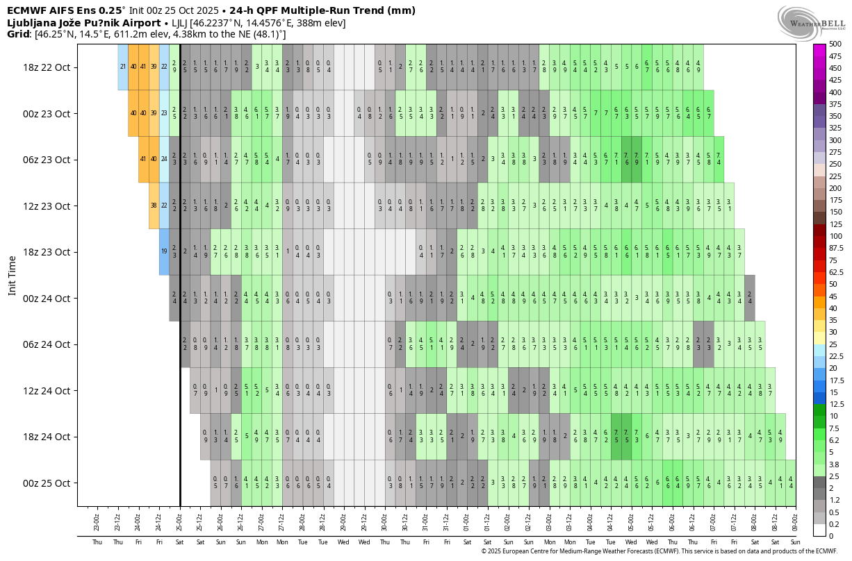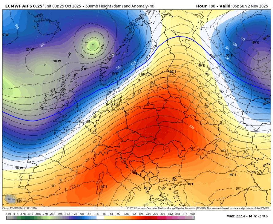 Za začetek novembra AIFS napoveduje prehodno okrepitev afriškega anticiklona nad našim območjem, kar je posledica dviga vrednosti geopotencialnih višin na 500 hPa na okoli 580 dekametrov. Ta vrednost, ki je za naše geografske širine izrazito visoka, nakazuje močno anticiklonalno cirkulacijo in prisotnost toplega jedra v srednji troposferi. Anticiklon prinaša zrak toplejšega afriškega izvora, kar vpliva na stabilnost ozračja. November pa je že čas, ko anticikloni prinašajo v nižine, večinoma meglo oz. nizko oblačnost, tam kjer jo bo sonce prebilo pa bo lahko zelo toplo za ta letni čas.