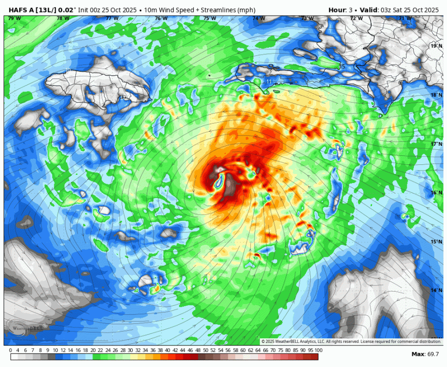 HAFS-A(Hurricane Analysis and Forecast System) animacija(klikni sliko) krepitve Melisse v orkan četrte stopnje s sunki blizu 300km/h pred Jamajko in predvidena nadaljnja pot po tem visokoresolucijskem modelu.