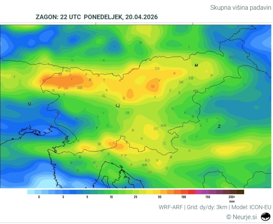 Skupna višina padavin kaže na precej “zanesljivo” situacijo – brez večjih razlik po državi, z maksimumom na zahodu in okoli 20–30 mm v večjem delu Slovenije.