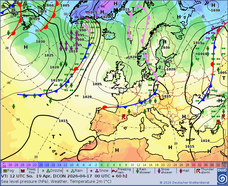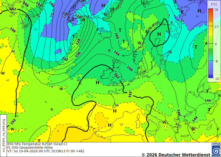 V nedeljo se bo nad srednjo Evropo še zadrževalo razmeroma toplo in stabilno zračno maso, kar potrjujejo temperature na 850 hPa, ki bodo nad Slovenijo večinoma med približno 6 in 10 °C. Vremensko dogajanje bo takrat še dokaj mirno, vendar že z jasno napovedjo spremembe. Nad zahodno Evropo in severnim Atlantikom se poglablja ciklonsko območje, povezano s frontalnim sistemom, ki se bo pomikal proti Alpam. V višinah se bo nad zahodno in srednjo Evropo poglabljala dolina hladnejšega zraka, kar je klasičen znak prihoda vremenske fronte.