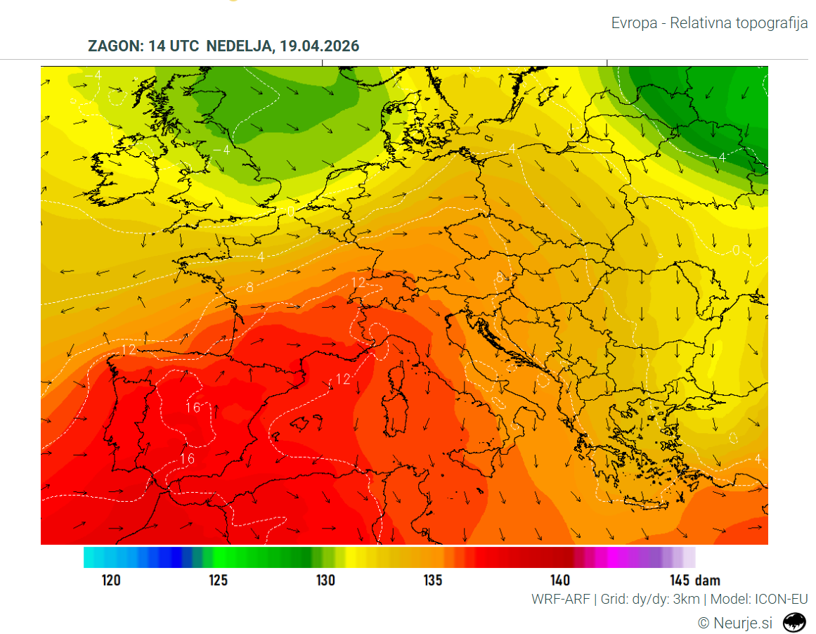 V nedeljo bo nad večjim delom Evrope prevladoval jugozahodni višinski tok, kar lepo potrjuje tudi relativna topografija, ki kaže na dvig geopotencialnih višin nad južno in deloma srednjo Evropo. Nad Sredozemljem in Alpami bo tako vztrajala razmeroma topla zračna masa, medtem ko se bo nad severozahodno Evropo že poglabljala izrazita višinska dolina. Slovenija bo na robu toplega sektorja, z dotokom toplega in postopno bolj vlažnega zraka iz jugozahoda. Vremensko bo dan še razmeroma stabilen, vendar z vse več visoke in srednje oblačnosti, ki bo napovedovala bližajočo se spremembo vremena.