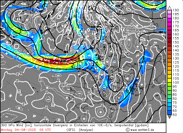 Močan curek zahodno od Britanije (barva – hitrost vetra). Izoline geopotenciala so prikazane v črni barvi, divergenčne izoline pa v beli barvi, vse na 300 hPa