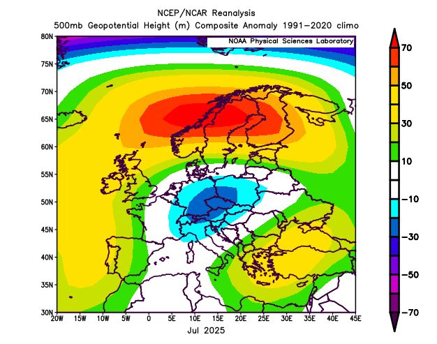 Anomalije geopotencialnih višin v juliju kažejo na zanimivo obliko podkve, redko videno v poletnih mesecih