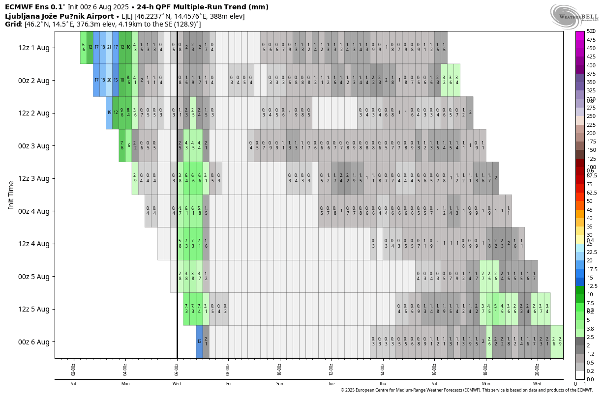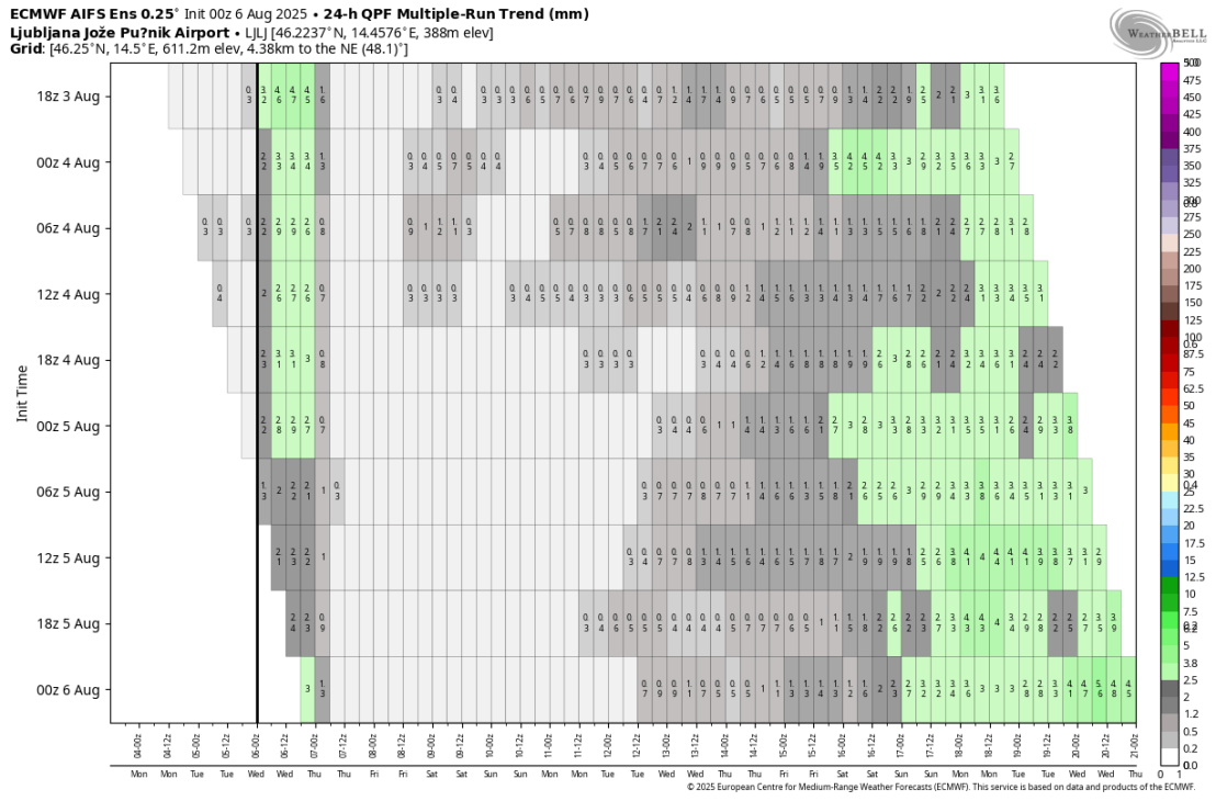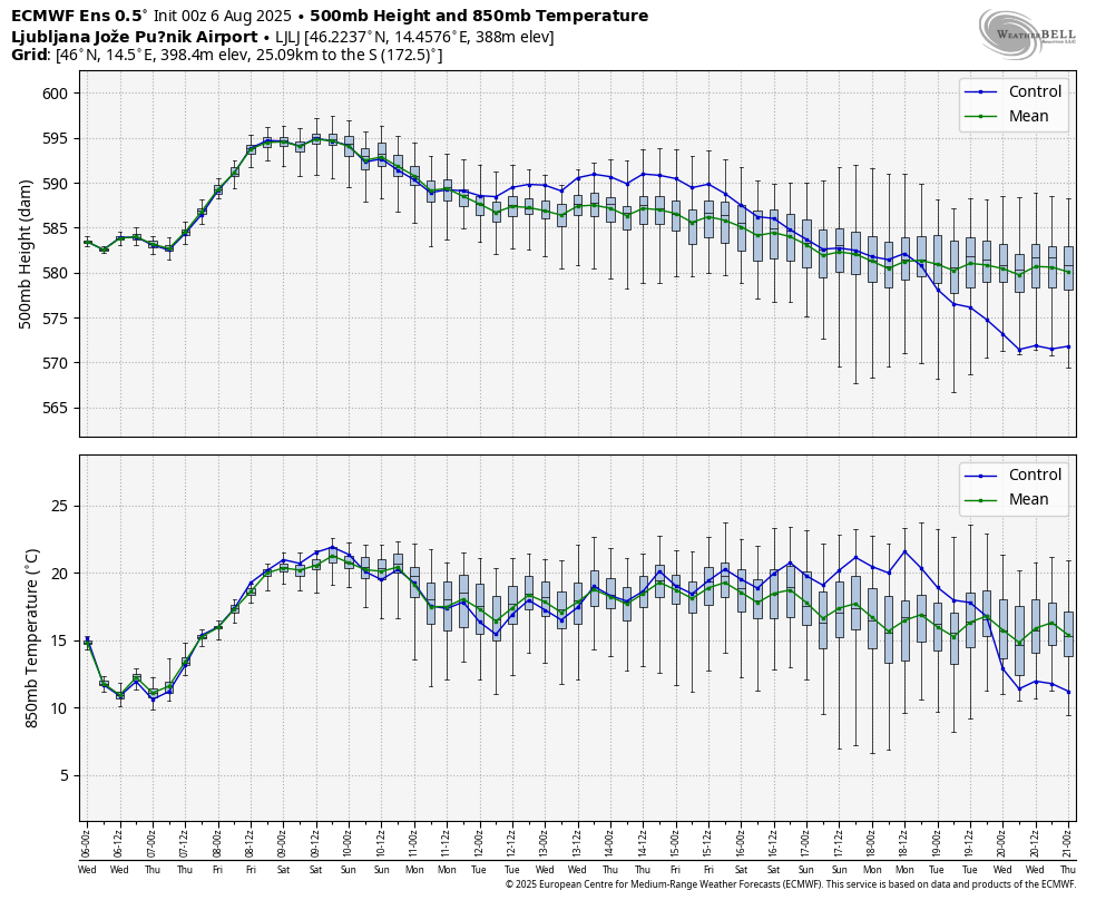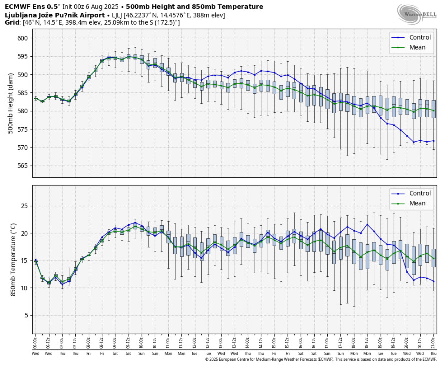 S pomikom grebena proti severu Evrope bo anticiklon nad območjem Alp postopno oslabel, verjetno lahko ob koncu naslednjega tedna pričakujemo spet več spremenljivosti, s kakšnim prodorom iz severa oz. severozahoda. Možnost padavin se po skupinskem izračunu AIFS poveča po prazniku.
