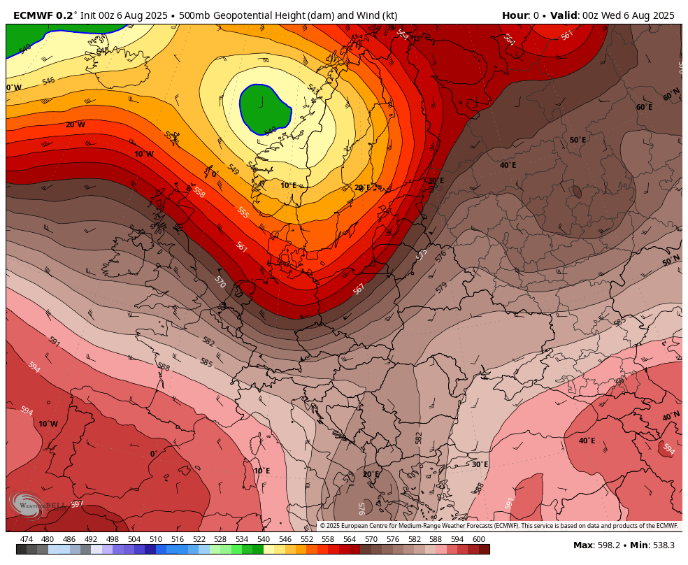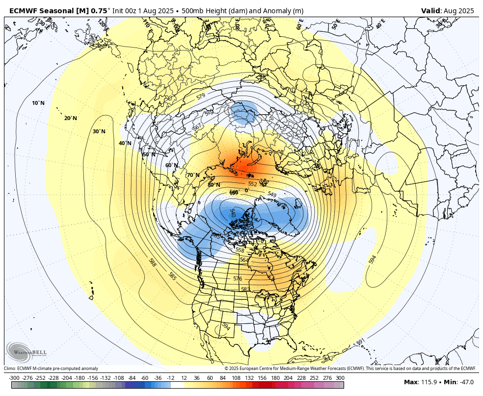 Zemljevid prikazuje višino 500mb (v dekametrih) in anomalijo (v metrih) za avgust 2025(vir weatherbell)