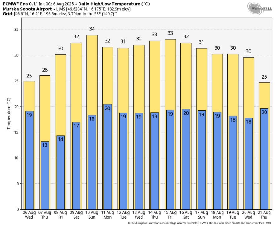 Pod območjem visokega zračnega pritiska in poletnih temperatur bomo verjetno, kot sem napovedal, še večji del naslednjega tedna. Temperature bodo vse dni večinoma nad 30 °C, na Primorskem in na vzhodu vse dni okoli 35 °C.
