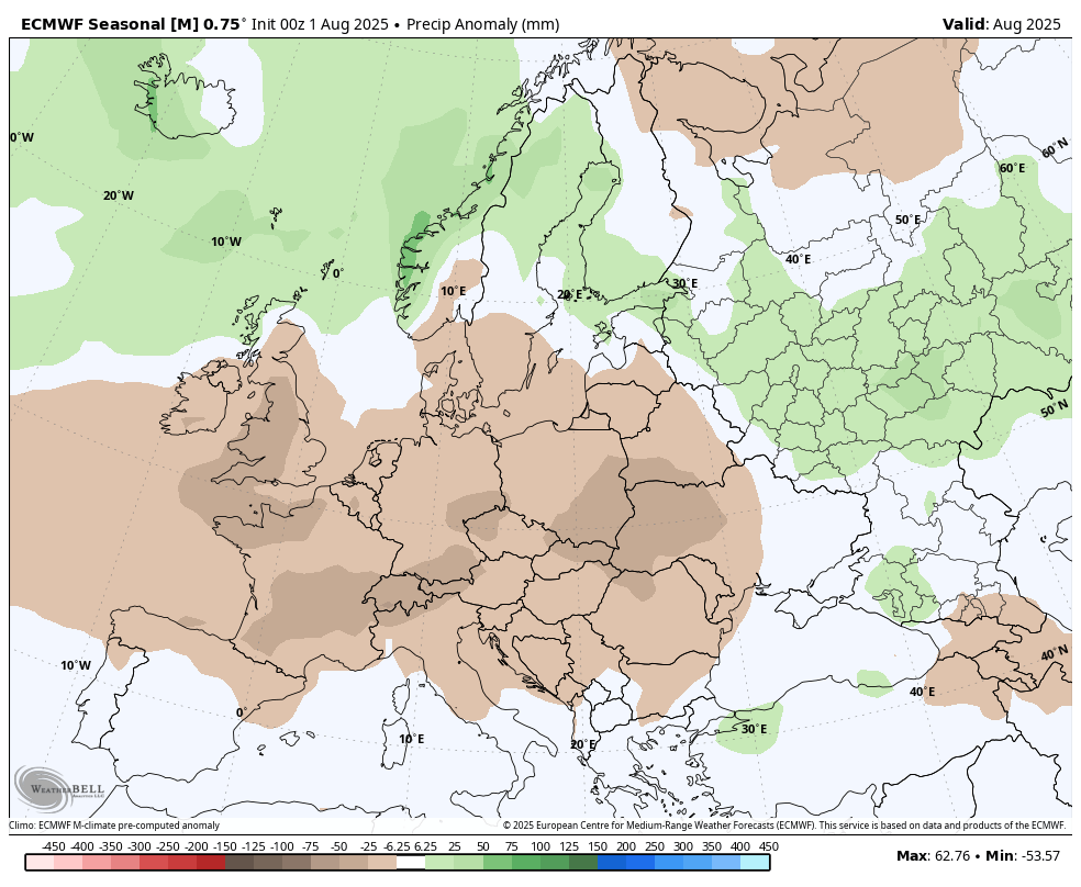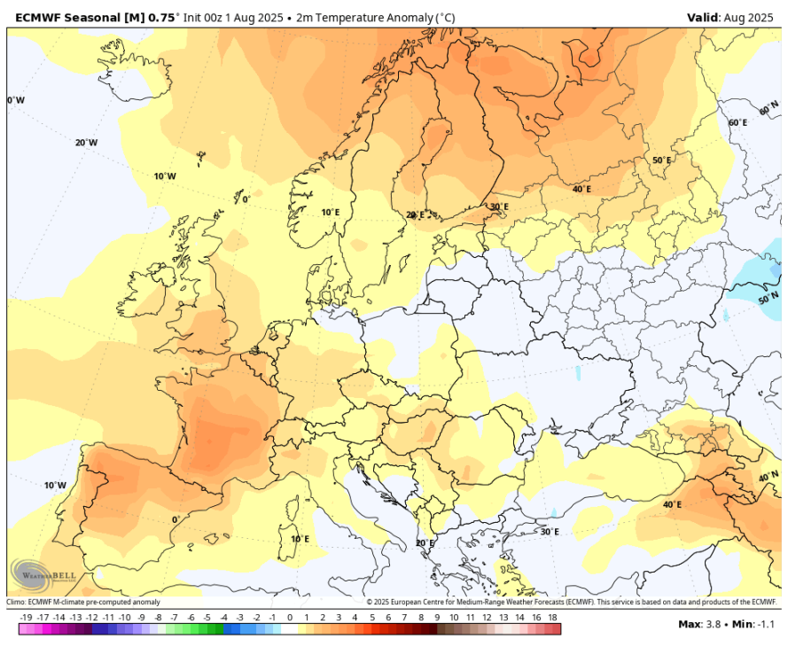 Za avgust je sezonski izračun precej milejši, kar se temperature tiče. Meni bolj logično, saj kaže višek toplote nad Zahodno in Severno Evropo. Nad vzhodno in zahodnim delom Rusije pa enakomerne anomalije, kar pomeni, da se tu pričakujejo temperature v skladu z dolgoletnim poprečjem. Za Slovenijo je odstopanje okoli stopinjo nad povprečjem.