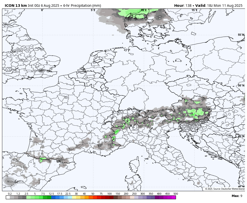 Padavinska karta kaže suho vreme nad Srednjo Evropo, jaz bi postavil zeleno barvo južneje čez južni del Skandinavije in nekje od Baltika proti Črnemu morju.