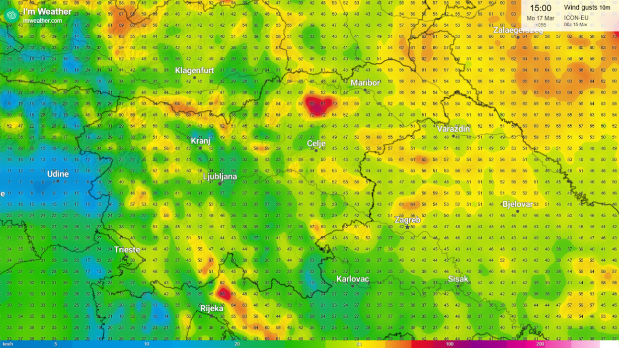 Sunki severnega vetra bodo v ponedeljek popoldne po nižinah severovzhodne Slovenije dosegli do okoli 70km/h, v višjih legah na tistem območju pa blizu 100km/h(vir imweather)