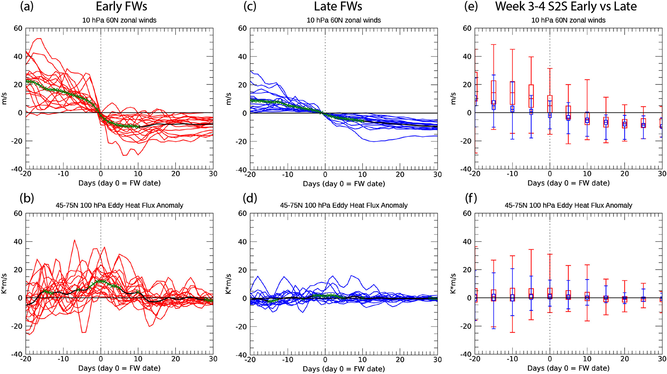 Povprečni zonalni vetrovi (m/s) pri 60 °S in 10 hPa(a in c) ter 45–75 °S in 100 hPa anomalija vrtinčnega toplotnega toka(b in d). Stratosferski zonalni vetrovi (sliki 1a in 1c) pred zgodnjimi FW so po definiciji bistveno močnejši kot pred poznimi FW. Box ploti v grafih (e) in (f) prikazujejo statistične razlike med dvema obdobjema FW. To analizo uporabimo, da razumemo, ali obstajajo bistvene razlike v atmosferi med zgodnjimi in poznejšimi FW dogodki.