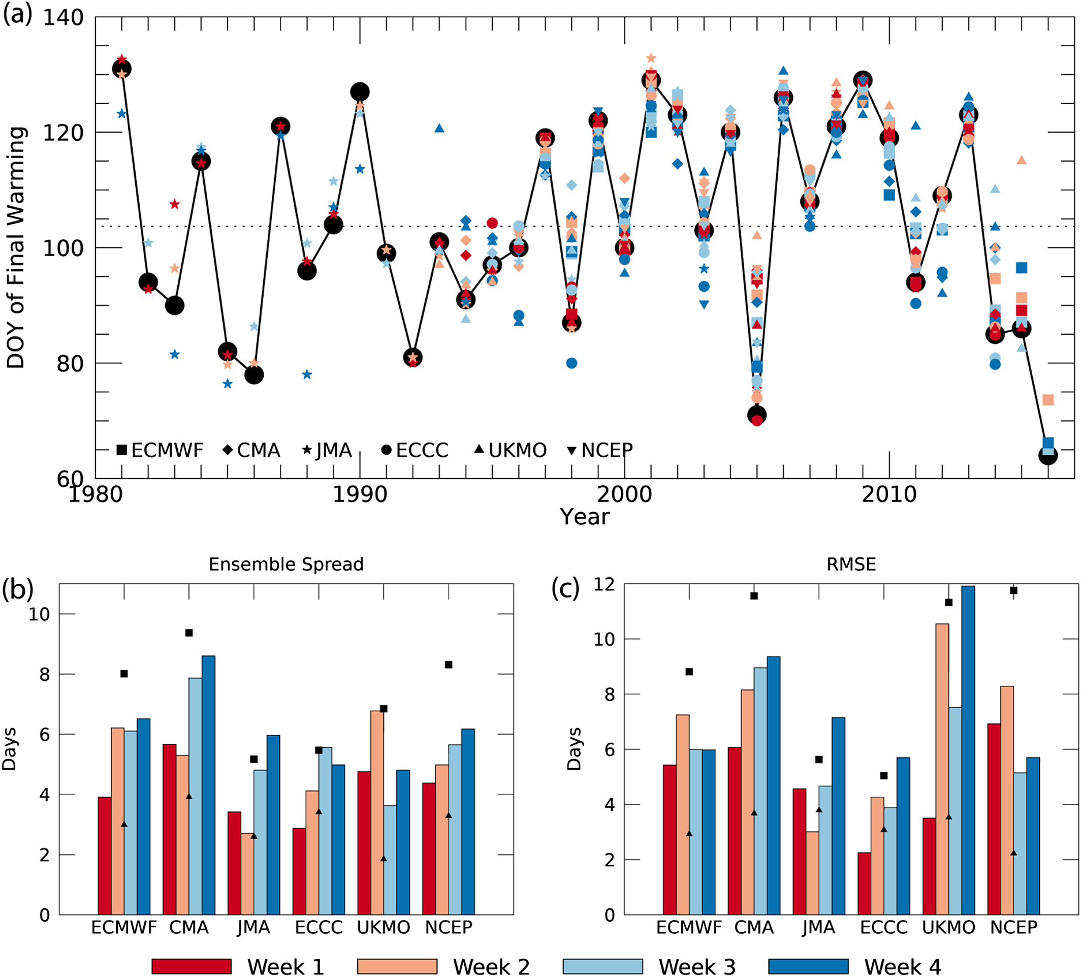 Zanimivo je, da nekatere modele (npr. NCEP in ECMWF) v drugem tednu moti “šum” zaradi majhnega števila primerov, medtem ko CMA in UKMO v 3.–4. tednu dosežeta napako več kot 8 dni. Kljub temu so napovedi splošnega časa FW-jev sorazmerno stabilne, kar nakazuje, da na njih vplivajo podnebni vzorci z dolgim trajanjem, kot so El Niño ali La Niña. Analiza za obdobje 1981–2016 pokaže, da se zgodnji FW pogosteje pojavijo med El Niño-jem (9 od 12 zim), pozni FW pa med La Niña (8 od 12 zim). Poleg tega so zime z La Niña pogosteje spremljale nenadna stratosferska segrevanja (SSW), kar verjetno podaljšuje trajanje polarnega vrtinca in zakasnjuje FW. V povprečju 45 % napovedi je natančno (±3 dni) do 20 dni vnaprej, pri čemer lažni alarmi (napovedan FW, ki se ne zgodi) predstavljajo le 18 %. Nekateri modeli dosežejo več kot 25 % uspešnosti še pri 30 dneh, kar presega zmogljivost napovedovanja zimskih SSW-jev. To poudarja, da so končna segrevanja kljub dinamični naravi bolj predvidljiva od drugih stratosferskih dogodkov, kar omogoča bolj zanesljive napovedi spomladanskega vremena.