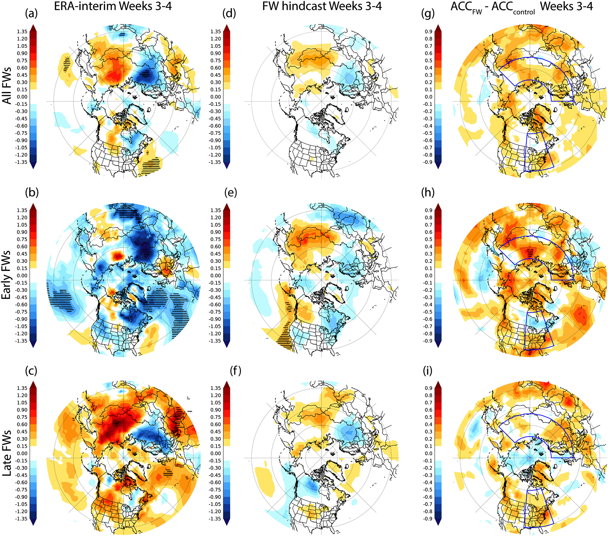 Povprečne temperaturne anomalije na 2m(a-c), 3-4 tedne po končnem segrevanju. Hindcast(d-f) za ta obdobje vključuje analizo, kako dobro je model napovedal končno segrevanje, in njegove posledice po tem, ko se je dogodek že zgodil. ACC(fw)-ACC(control) (g-i) pomeni, koliko natančnejše so napovedi za 3–4 tedne, če model upošteva vpliv končnega segrevanja v stratosferi (ACC final warming) v primerjavi s standardno napovedjo brez tega vpliva (ACC control). Pozitivna razlika kaže, da upoštevanje stratosferskih procesov izboljša zanesljivost dolgoročnih napovedi