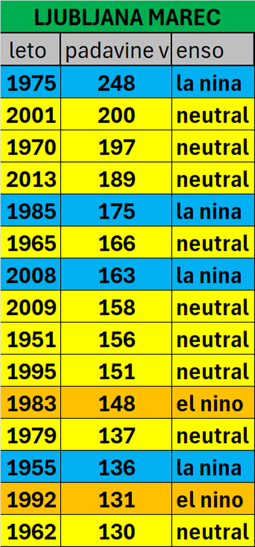 Marčevske padavine v Ljubljani znajo biti ekstremne – od leta 1951 je 15 marcev preseglo 130 mm. Absolutni rekord drži leto 1975 s 248 mm dežja, ko je vpliv La Niña okrepil padavine. S to fazo ENSO so povezani še mokri marci 1985, 2008 in 1955. Vendar 9 od 15 najbolj mokrih marcev je potekalo v nevtralnih razmerah (brez El Niñota ali La Niñe), kot so 2001 (200 mm) ali 2013 (189 mm). Tu so odločilni lokalni dejavniki: vztrajne frontalne cone, vlažni vetrovi z Jadrana ali vpad hladnega zraka. El Niño je v marcu redko glavni krivec – le leta 1983 (148 mm) in 1992 (131 mm) sta izstopajoča primera. Razlog? El Niño pogosteje presuši južno Evropo. Poleg ENSO vplivajo še Atlantska oscilacija (AO), sredozemski nizki tlaki in zgodnje spomladansko topljenje snega. dežja in taljenju snega. Povprečno vsakih 5 let Ljubljani v marcu preplavi ekstremen dež. Kljub pozornosti na poletne nevihte so spomladanske poplave enako nevarne, še posebej ob sočasnem padanju in taljenju snega. Sicer podatki kažejo, da je bilo pred letom 1951 še več ekstremnih marčevskih padavin, rekord drži leto 1937 s kar 315mm, vendar pred letom 1951 nimamo točnih podatkov o fazi ENSO.