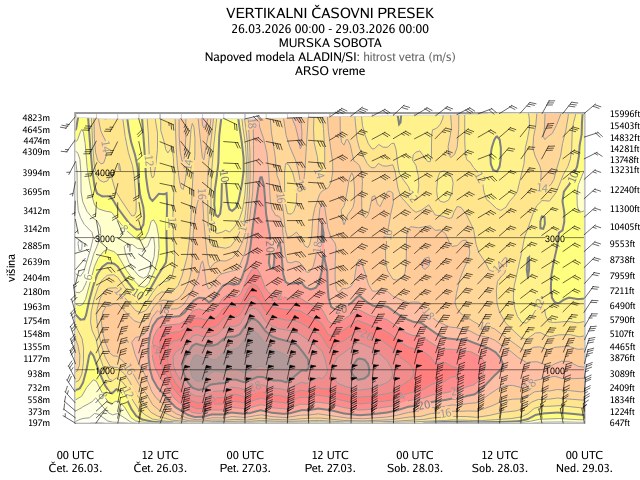 Slika prikazuje vertikalni presek za Mursko Soboto (ARSO). Tudi drugod po državi se bo veter v popoldanskih urah okrepil in večinoma dosegal hitrosti med 70 in 100 km/h, lokalno pa lahko tudi okoli ali nad 110 km/h. V višjih legah bo nevarnost še večja, saj lahko sunki presežejo 130 km/h. Ponekod se pričakuje obsežen vetrolom.
