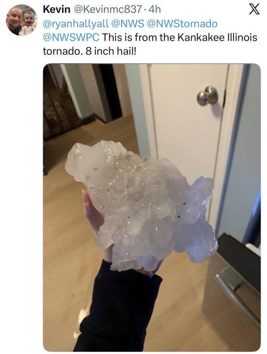 V ameriški zvezni državi Illinois so po neurjih v ponedeljek zvečer našli točo, ki bi lahko postala nova svetovna rekorderka. Po poročilih je imela premer približno 20 cm+, kar je približno velikost medene melone. Najdbo je v ZDA preverjala Nacionalna meteorološka služba (National Weather Service), za uradno potrditev svetovnega rekorda pa primer nato ocenjuje Svetovna meteorološka organizacija (WMO).
