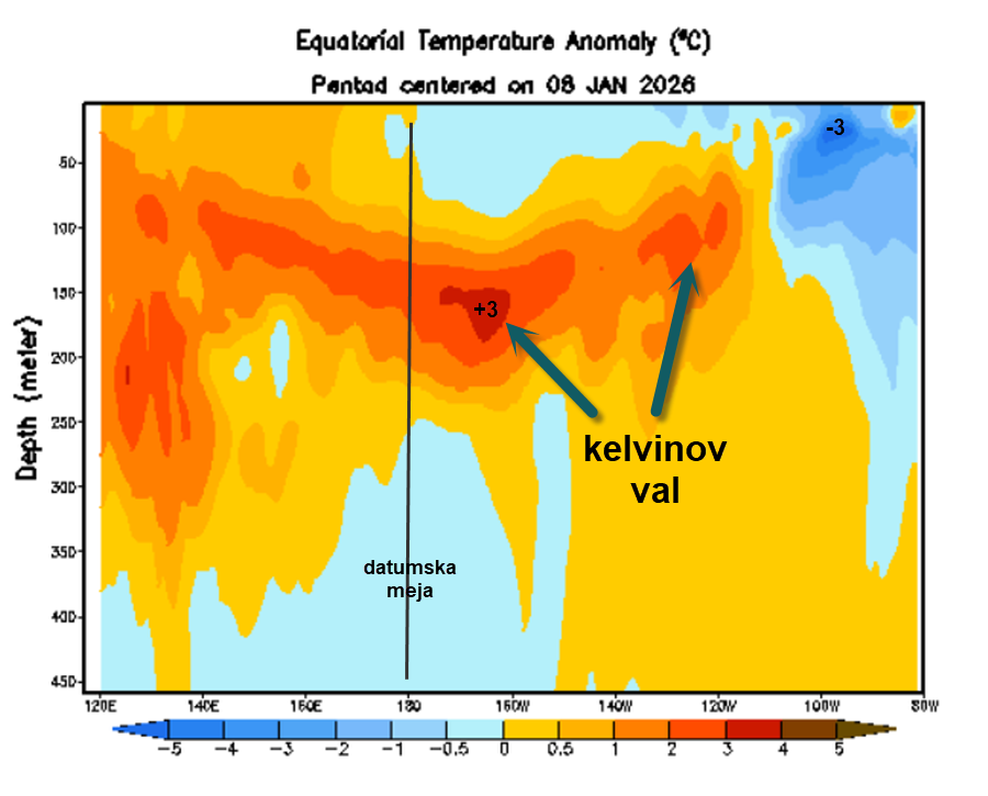 Po zadnjih podatkih ameriške Nacionalne uprave za oceane in atmosfero (NOAA) iz začetka januarja 2026 La Niña še vedno vztraja, a hitro slabi. Pod površjem oceana se namreč širi močan val tople vode – tako imenovani downwelling Kelvinov val –, ki potuje proti vzhodu in postopoma izpodriva hladne vode ob obali Južne Amerike. Ta val je impresiven, saj prinaša pozitivne temperaturne anomalije globoko pod površjem, ki se že širijo proti datumski meji in naprej proti Ameriki. Ko bo ta val dosegel obalo, kar se pričakuje v naslednjih dveh do štirih tednih, se bo hladna površinska voda hitro segrela in La Niña bo uradno končana.