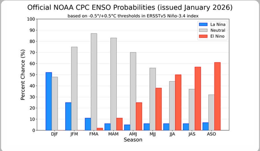 Napovedi so precej enotne. Uradna verjetnost prehoda v nevtralno stanje (ENSO-neutral) v obdobju januar–marec 2026 znaša kar 75 odstotkov. To pomeni, da bo do konca februarja ali v začetku marca zelo verjetno že vladalo nevtralno stanje, brez izrazitega hladnega ali toplega signala iz Pacifika. Nevtralno obdobje naj bi nato trajalo vsaj do pozne pomladi, morda celo dlje. Za drugo polovico leta 2026 pa se pojavljajo naraščajoče možnosti za povratek El Niña, a so te napovedi zaradi tako imenovane spomladanske ovire zanesljivosti še zelo negotove.
